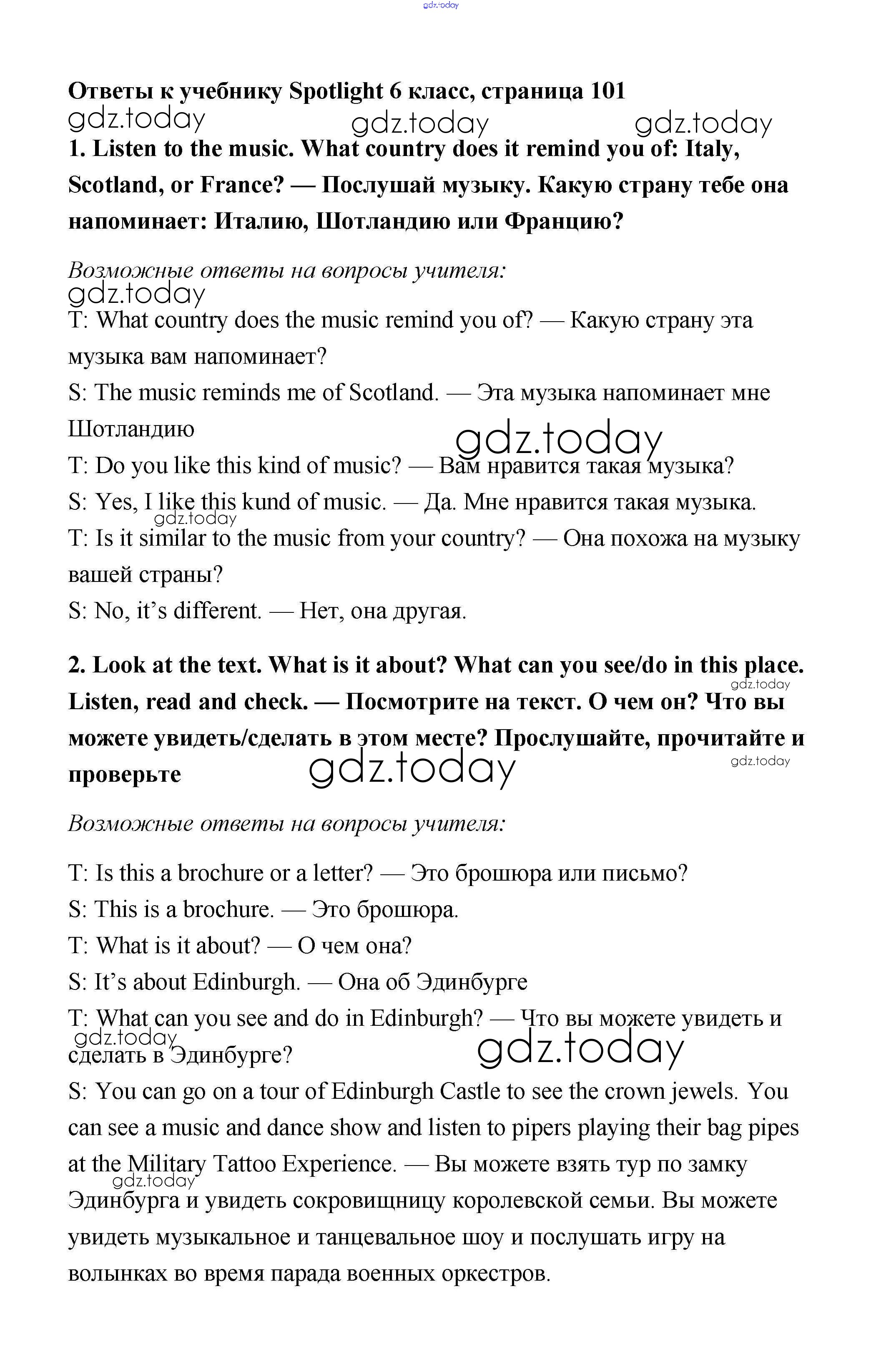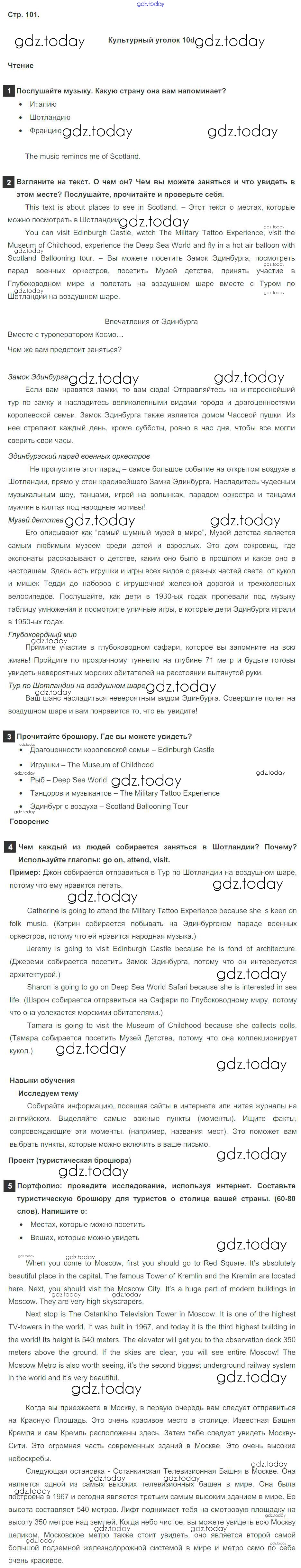 На страницах сайта gdz.today вы найдете учебный и вспомогательный материал, направленный на улучшения знаний школьной программы. ГДЗ - онлайн мир знаний Решение к Module 10. Holiday Time. Страницы 101 Учебнику по Английскому языку для 6 класса Ваулина, Дули Просвещение Spotlight 2017
