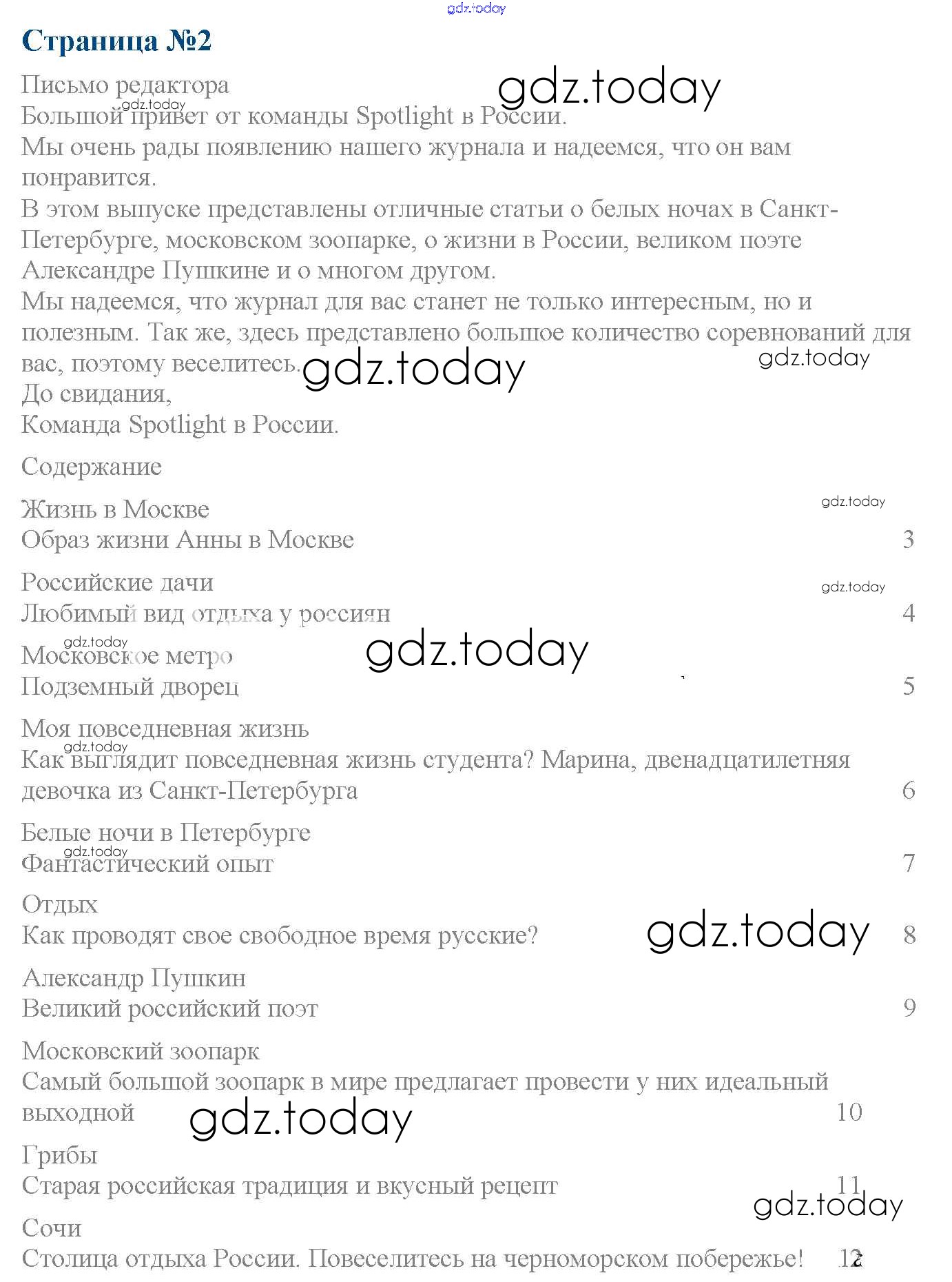 На страницах сайта gdz.today вы найдете учебный и вспомогательный материал, направленный на улучшения знаний школьной программы. ГДЗ - онлайн мир знаний Решение к Spotlight on Russia. Страницы 2 Учебнику по Английскому языку для 6 класса Ваулина, Дули Просвещение Spotlight 2017