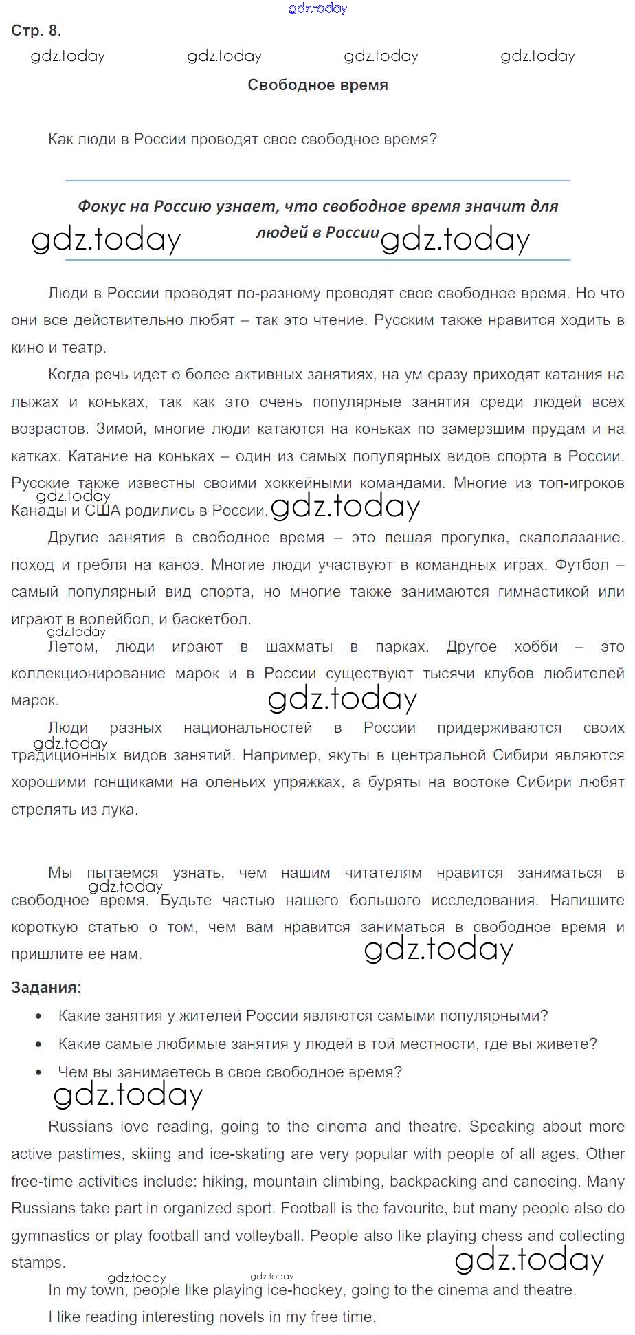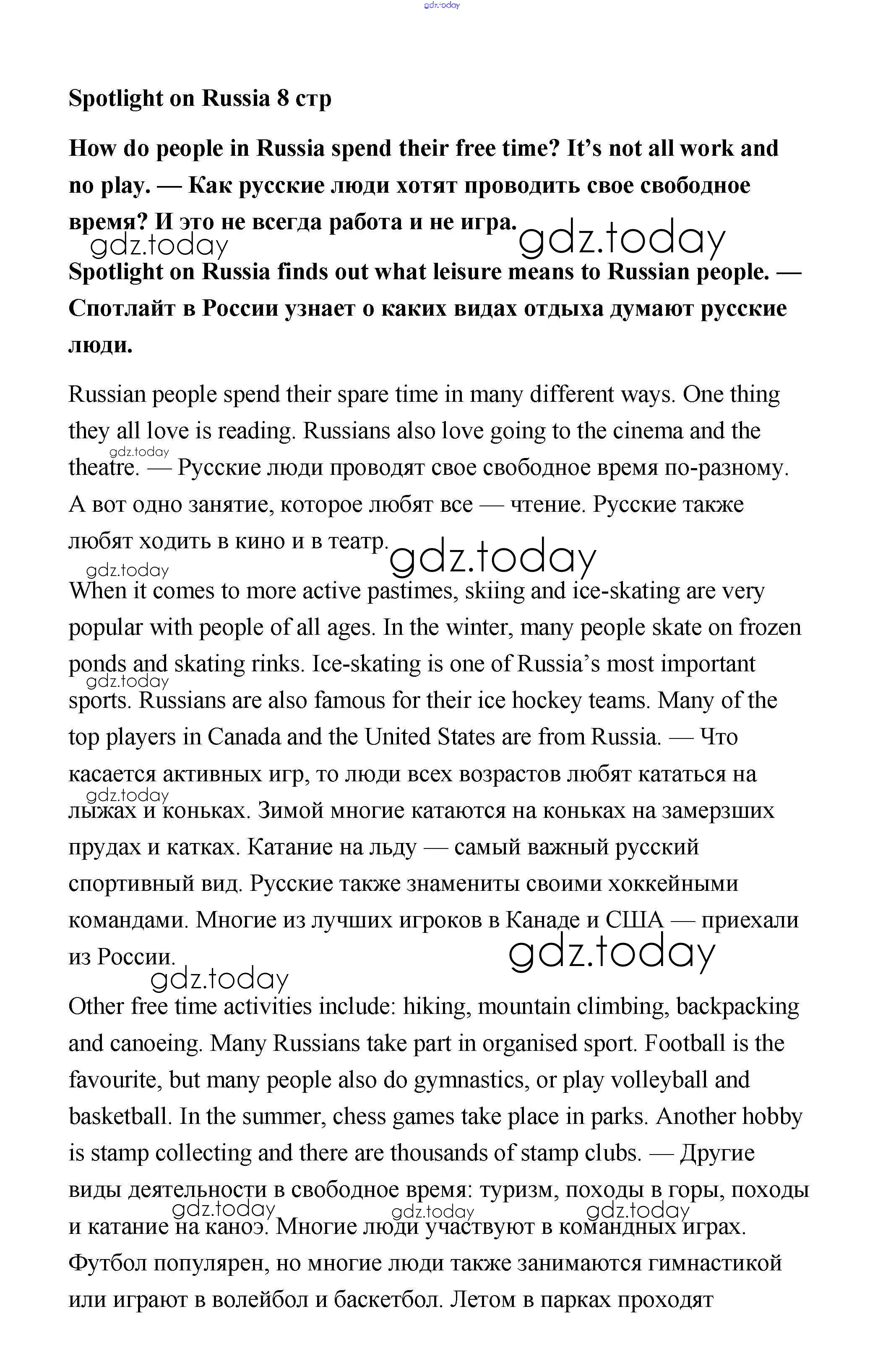 На страницах сайта gdz.today вы найдете учебный и вспомогательный материал, направленный на улучшения знаний школьной программы. ГДЗ - онлайн мир знаний Решение к Spotlight on Russia. Страницы 8 Учебнику по Английскому языку для 6 класса Ваулина, Дули Просвещение Spotlight 2017