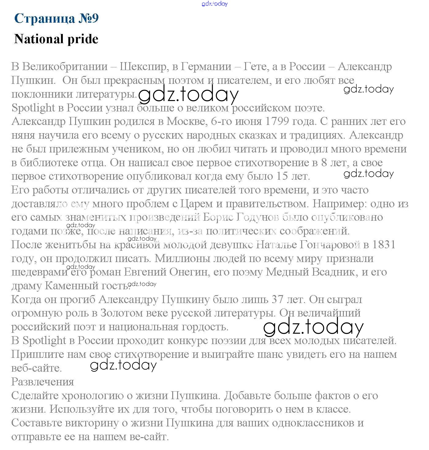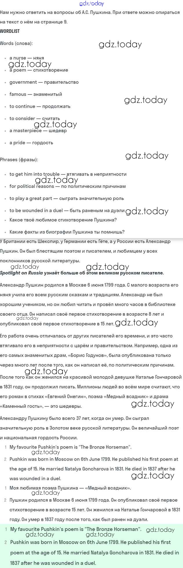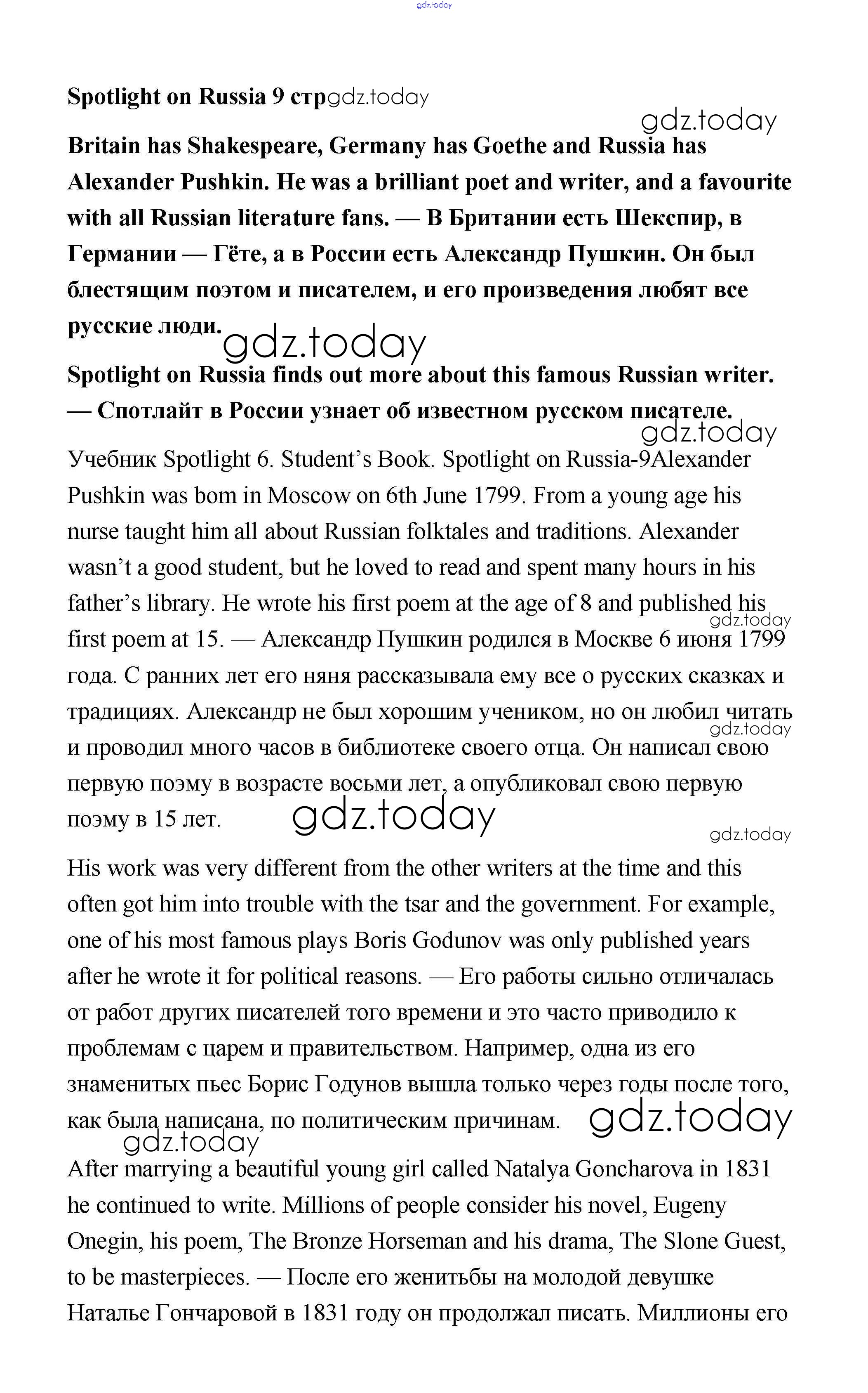 На страницах сайта gdz.today вы найдете учебный и вспомогательный материал, направленный на улучшения знаний школьной программы. ГДЗ - онлайн мир знаний Решение к Spotlight on Russia. Страницы 9 Учебнику по Английскому языку для 6 класса Ваулина, Дули Просвещение Spotlight 2017