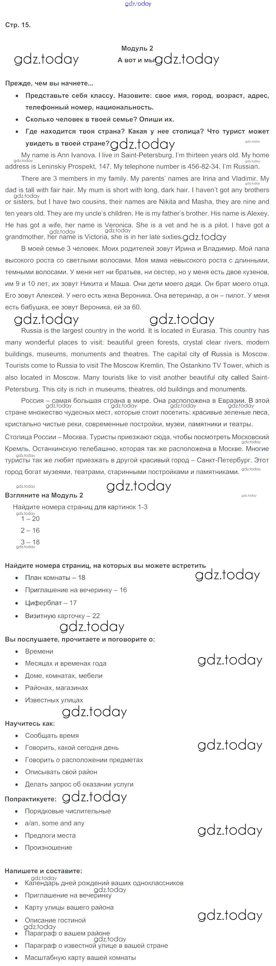 Ответы к Решение к Module 2. Here we are! Страницы 15 Учебнику по Английскому языку для 6 класса Ваулина, Дули Просвещение Spotlight 2017