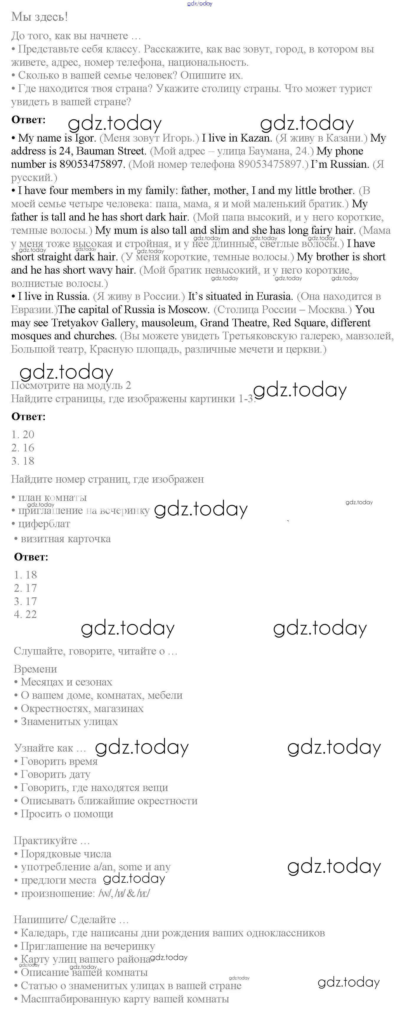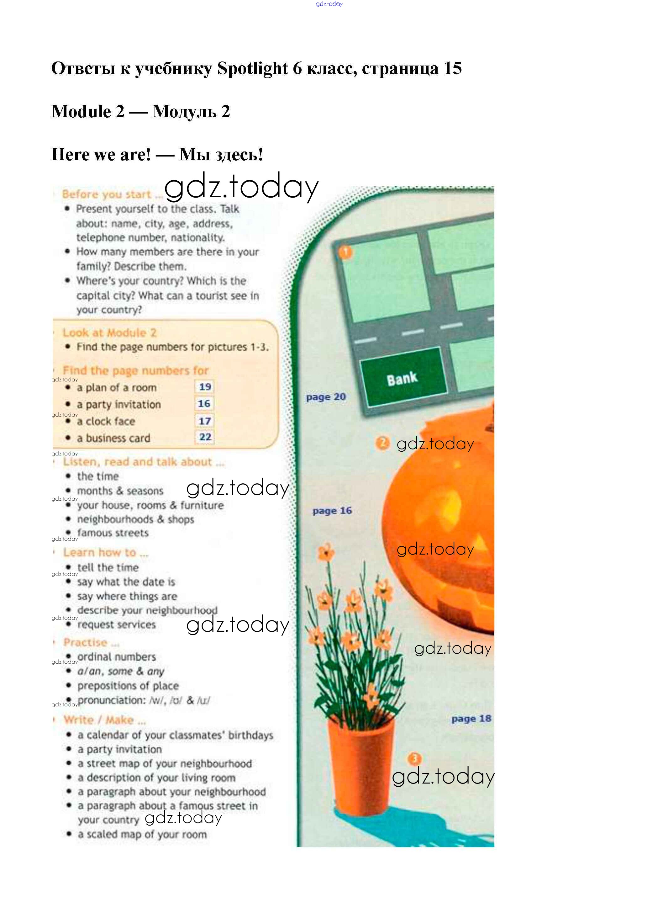 На страницах сайта gdz.today вы найдете учебный и вспомогательный материал, направленный на улучшения знаний школьной программы. ГДЗ - онлайн мир знаний Решение к Module 2. Here we are! Страницы 15 Учебнику по Английскому языку для 6 класса Ваулина, Дули Просвещение Spotlight 2017