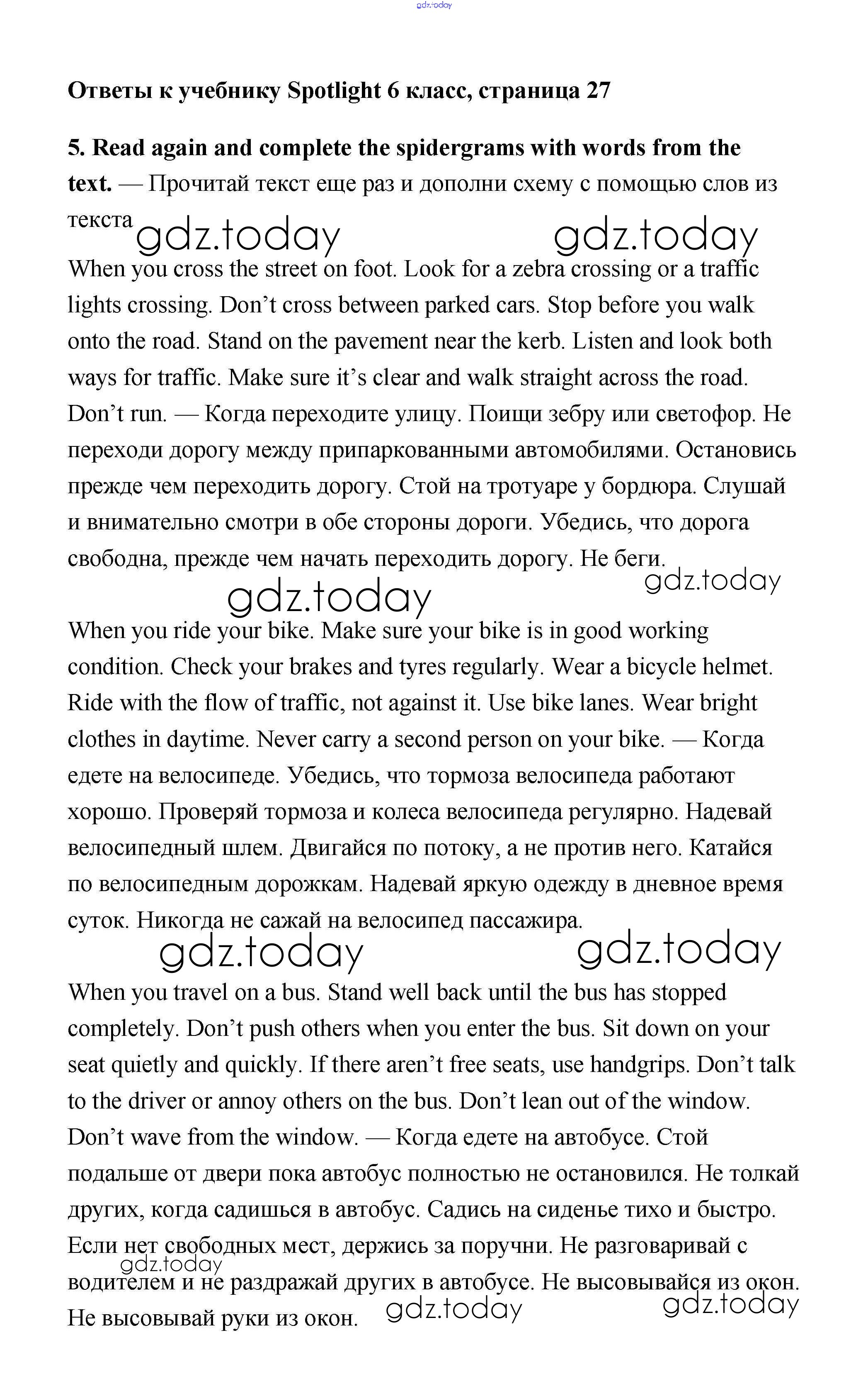 На страницах сайта gdz.today вы найдете учебный и вспомогательный материал, направленный на улучшения знаний школьной программы. ГДЗ - онлайн мир знаний Решение к Module 3. Getting around. Страницы 27 Учебнику по Английскому языку для 6 класса Ваулина, Дули Просвещение Spotlight 2017