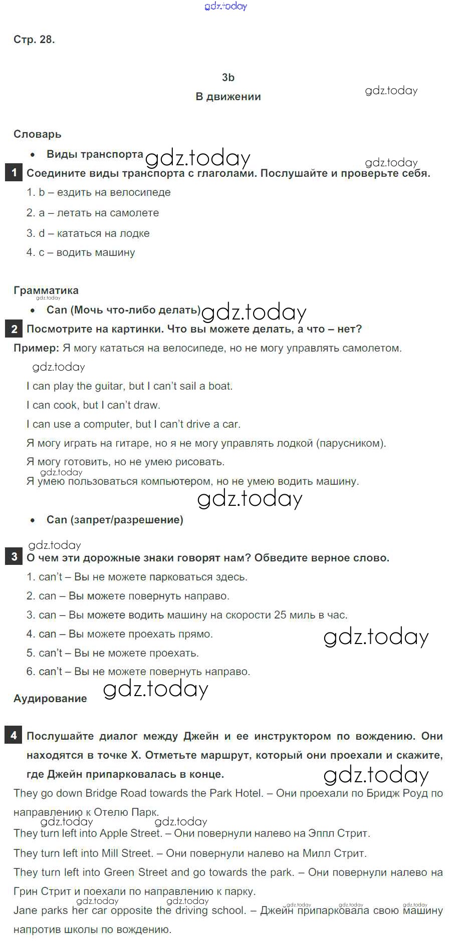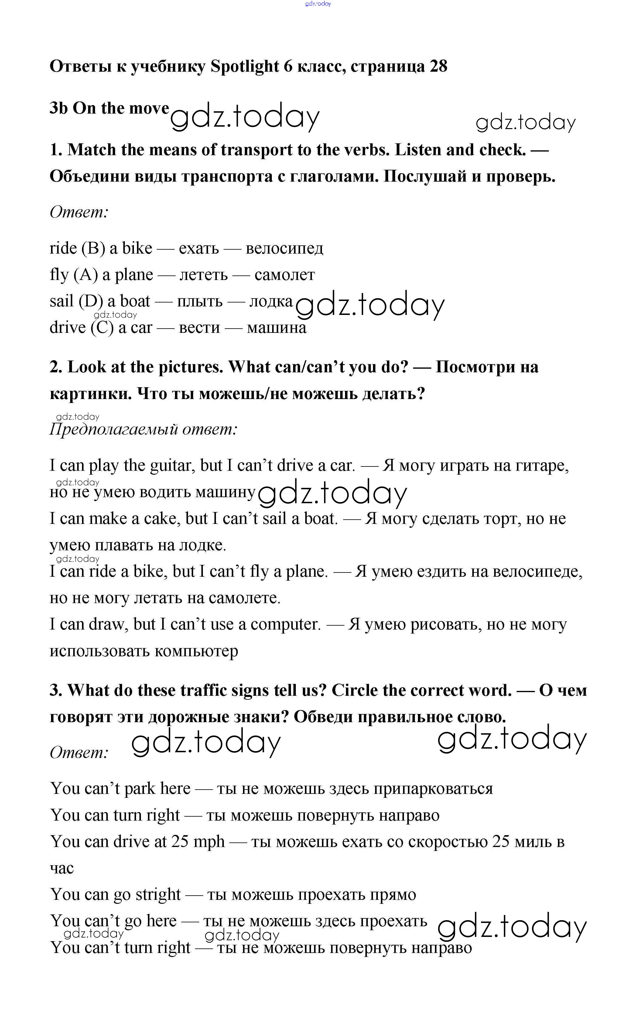 На страницах сайта gdz.today вы найдете учебный и вспомогательный материал, направленный на улучшения знаний школьной программы. ГДЗ - онлайн мир знаний Решение к Module 3. Getting around. Страницы 28 Учебнику по Английскому языку для 6 класса Ваулина, Дули Просвещение Spotlight 2017