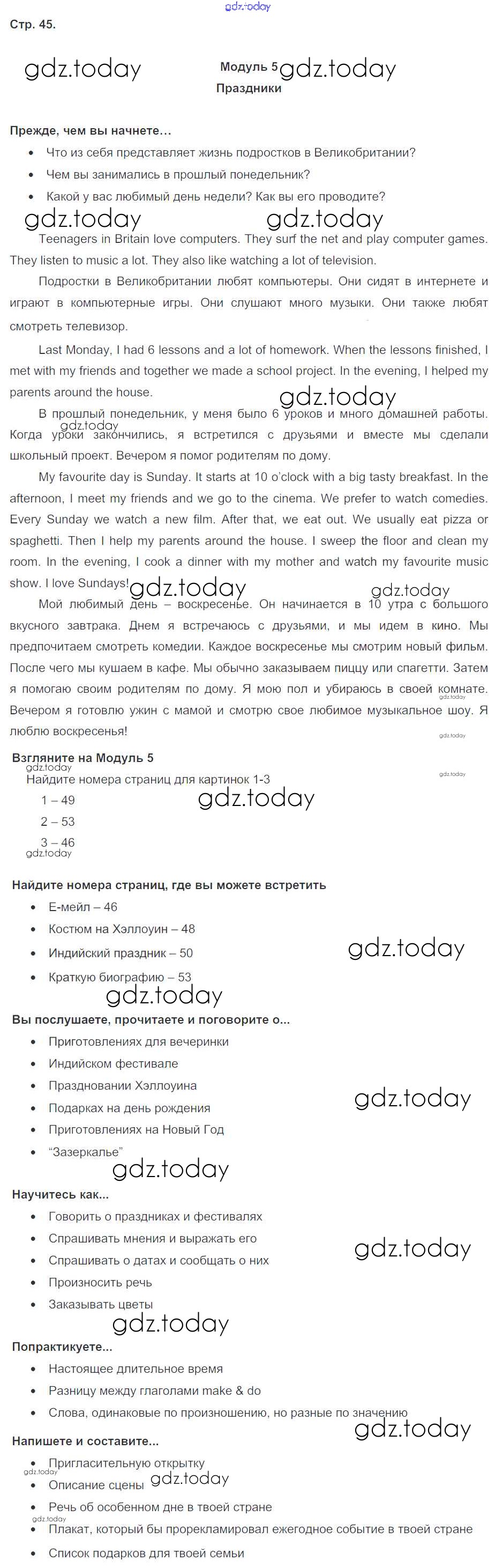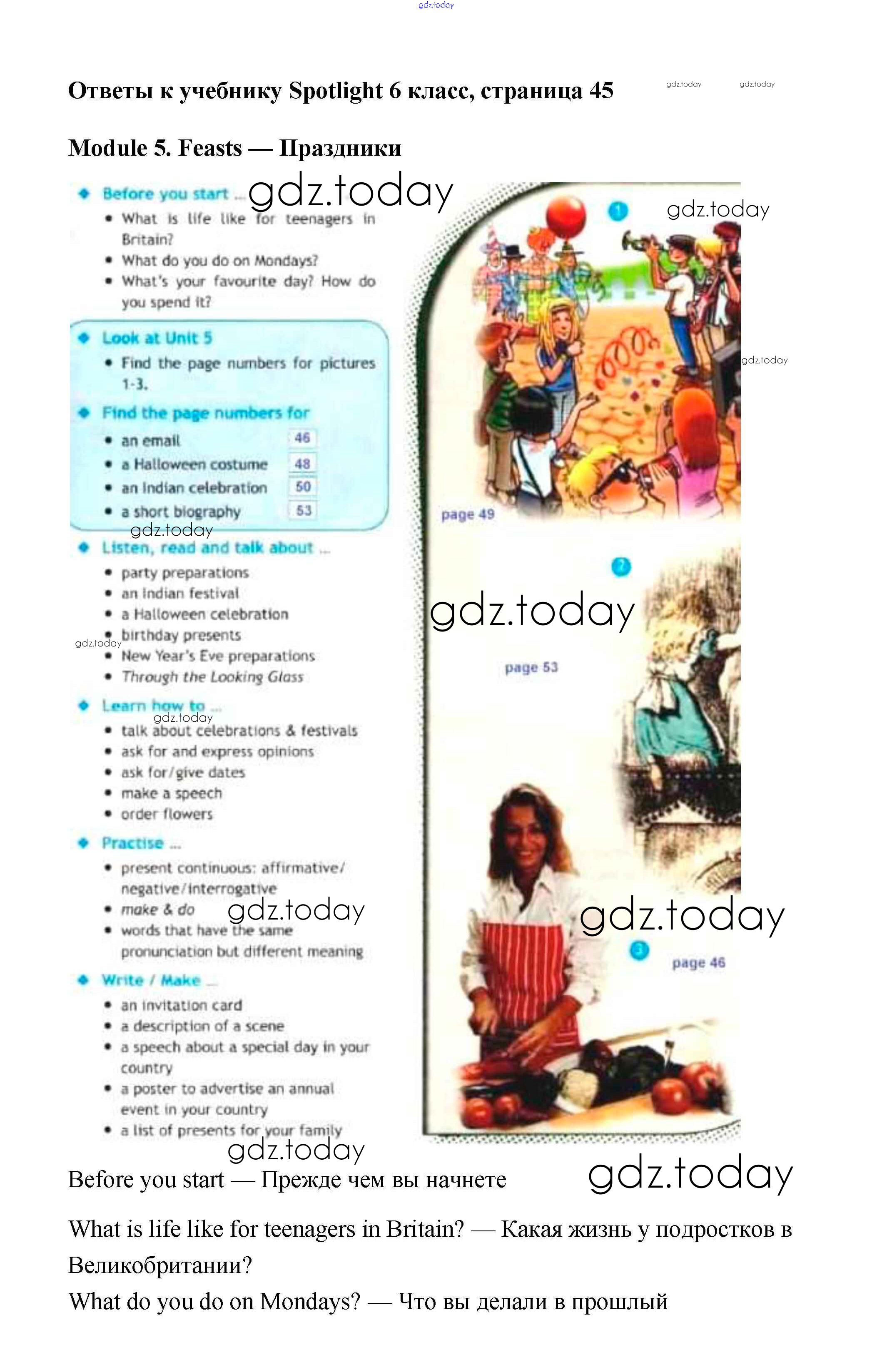 На страницах сайта gdz.today вы найдете учебный и вспомогательный материал, направленный на улучшения знаний школьной программы. ГДЗ - онлайн мир знаний Решение к Module 5. Feasts. Страницы 45 Учебнику по Английскому языку для 6 класса Ваулина, Дули Просвещение Spotlight 2017