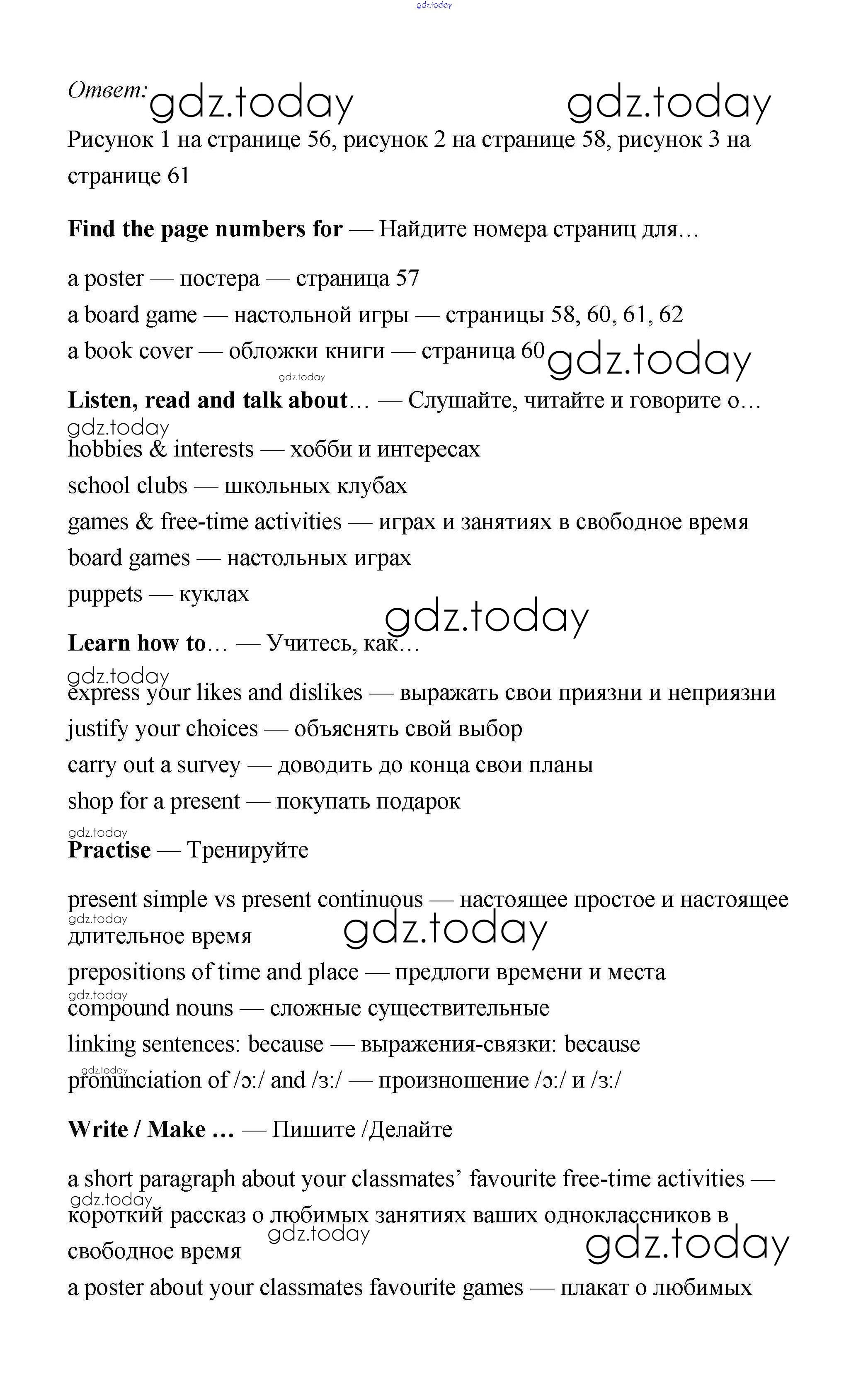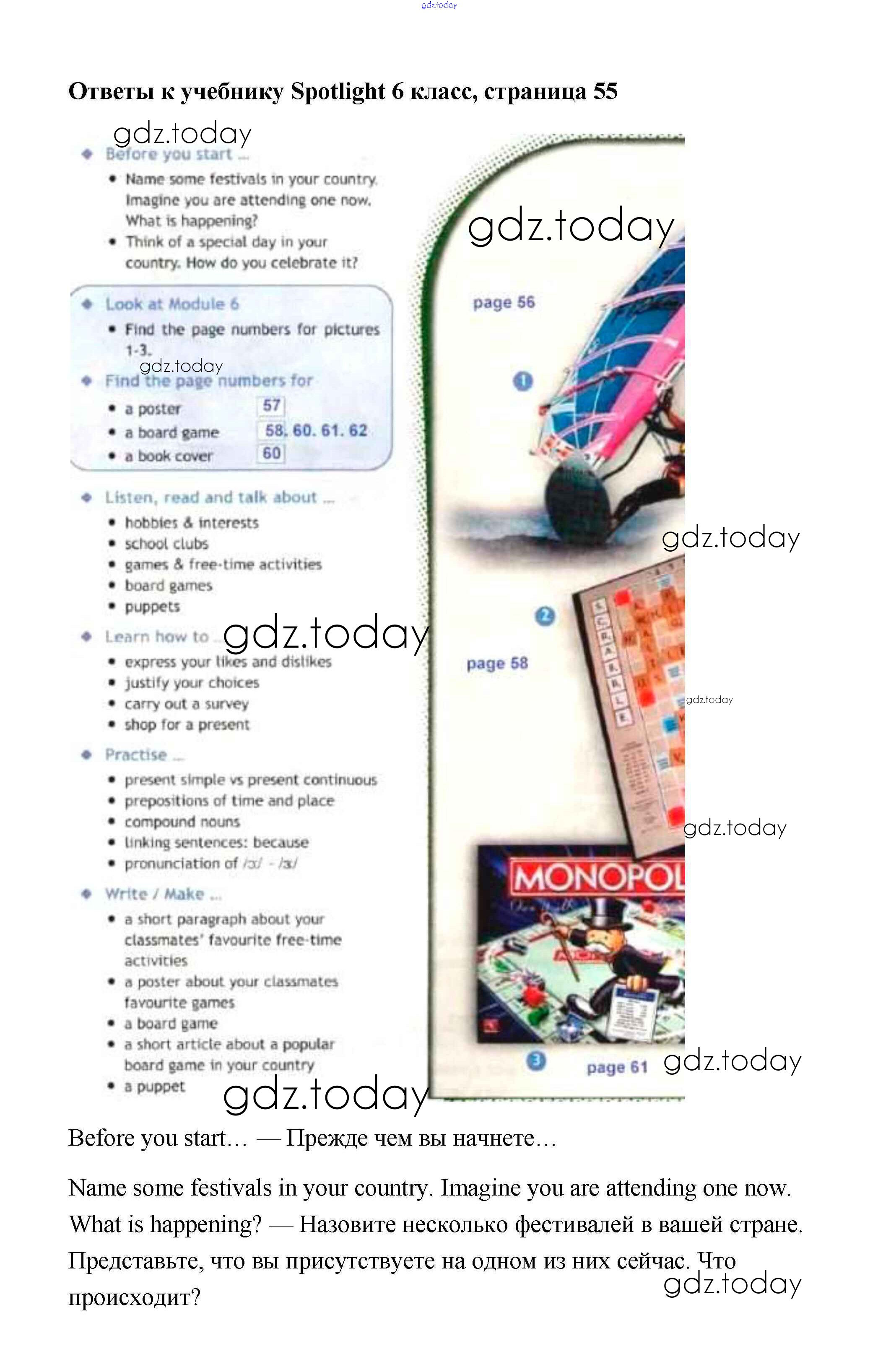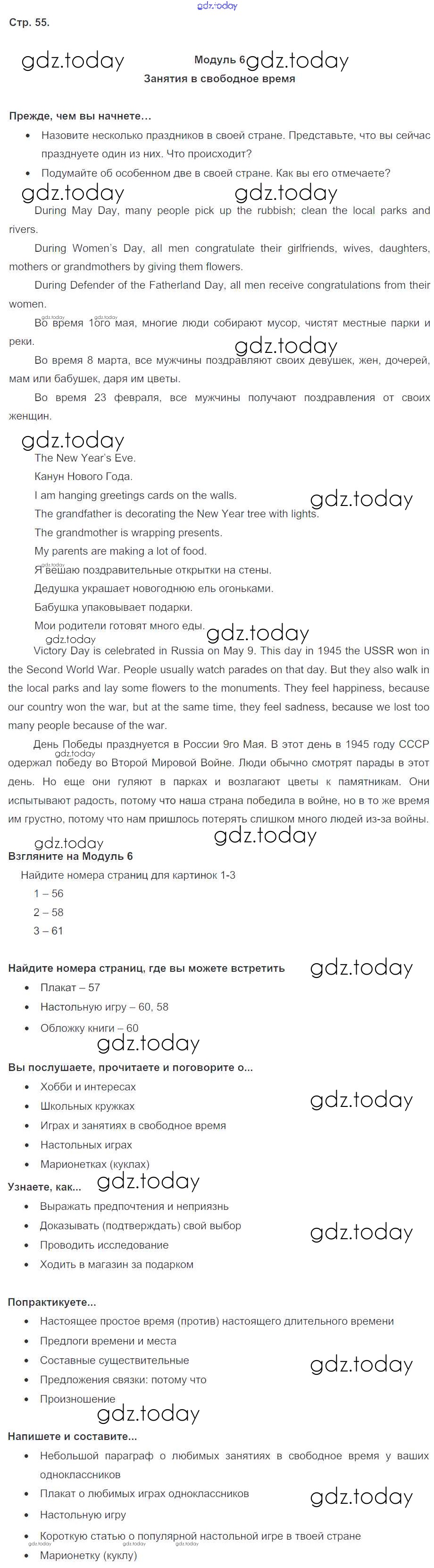 На страницах сайта gdz.today вы найдете учебный и вспомогательный материал, направленный на улучшения знаний школьной программы. ГДЗ - онлайн мир знаний Решение к Module 6. Leisure activities. Страницы 55 Учебнику по Английскому языку для 6 класса Ваулина, Дули Просвещение Spotlight 2017