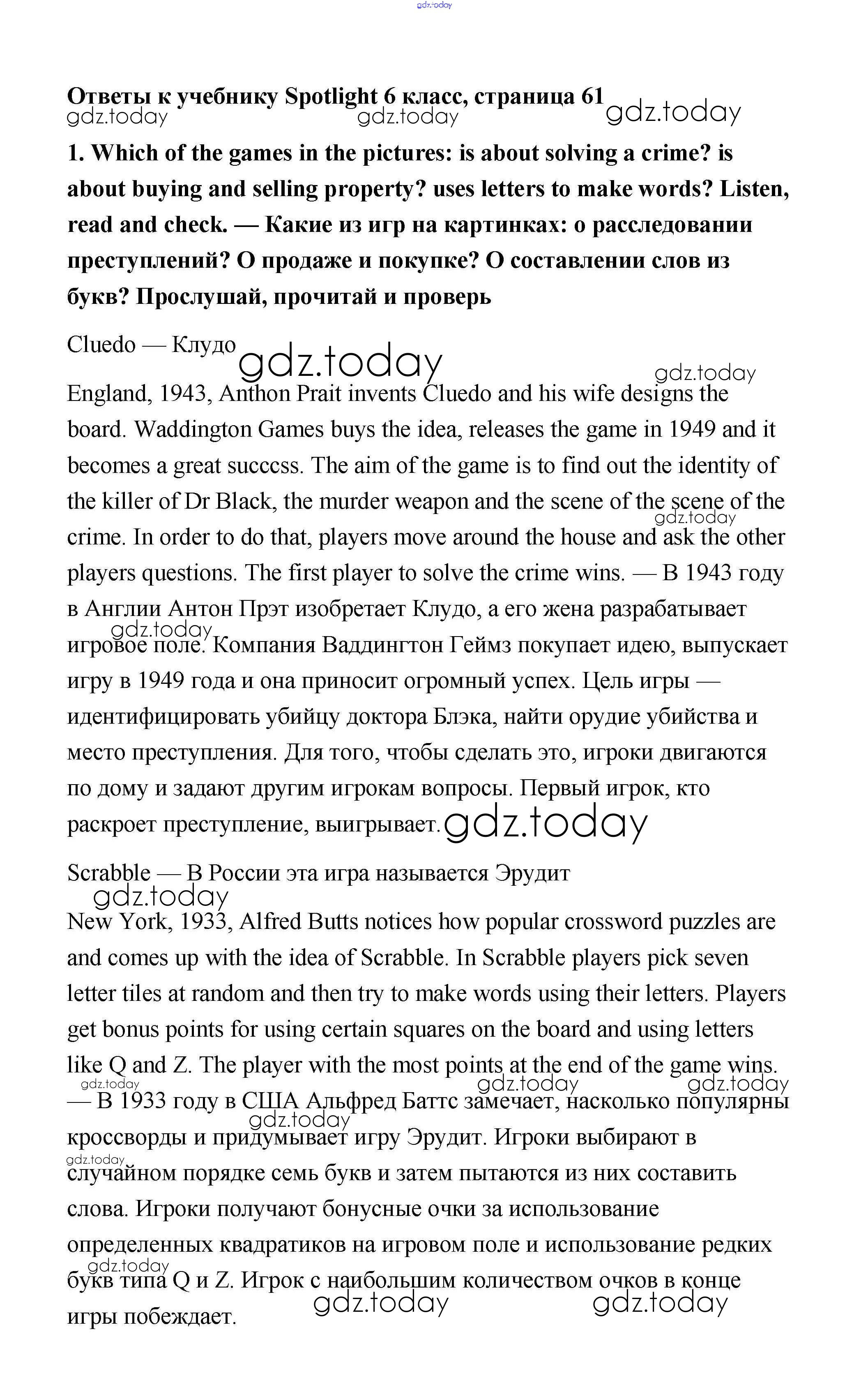 На страницах сайта gdz.today вы найдете учебный и вспомогательный материал, направленный на улучшения знаний школьной программы. ГДЗ - онлайн мир знаний Решение к Module 6. Leisure activities. Страницы 61 Учебнику по Английскому языку для 6 класса Ваулина, Дули Просвещение Spotlight 2017