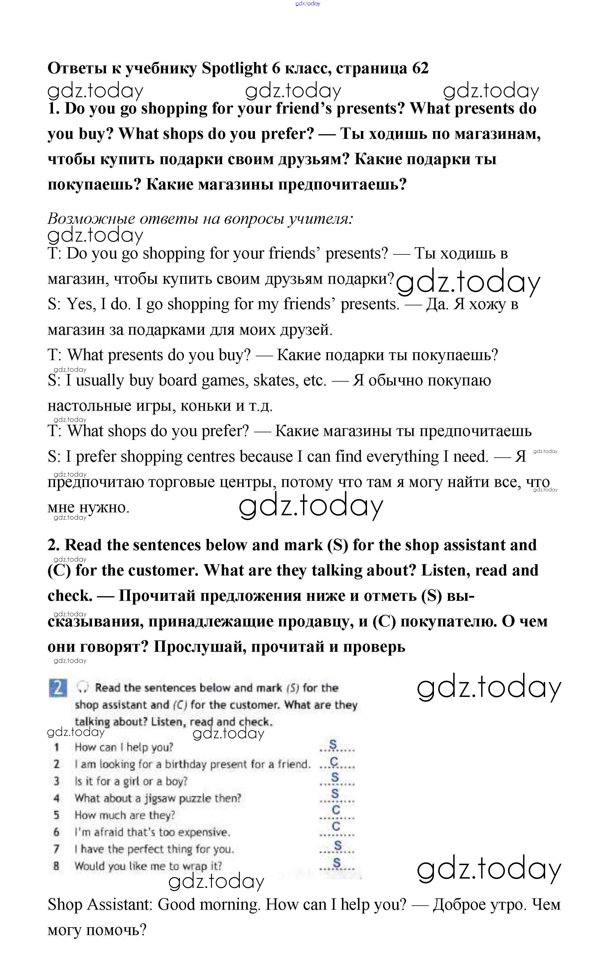 На страницах сайта gdz.today вы найдете учебный и вспомогательный материал, направленный на улучшения знаний школьной программы. ГДЗ - онлайн мир знаний Решение к Module 6. Leisure activities. Страницы 62 Учебнику по Английскому языку для 6 класса Ваулина, Дули Просвещение Spotlight 2017