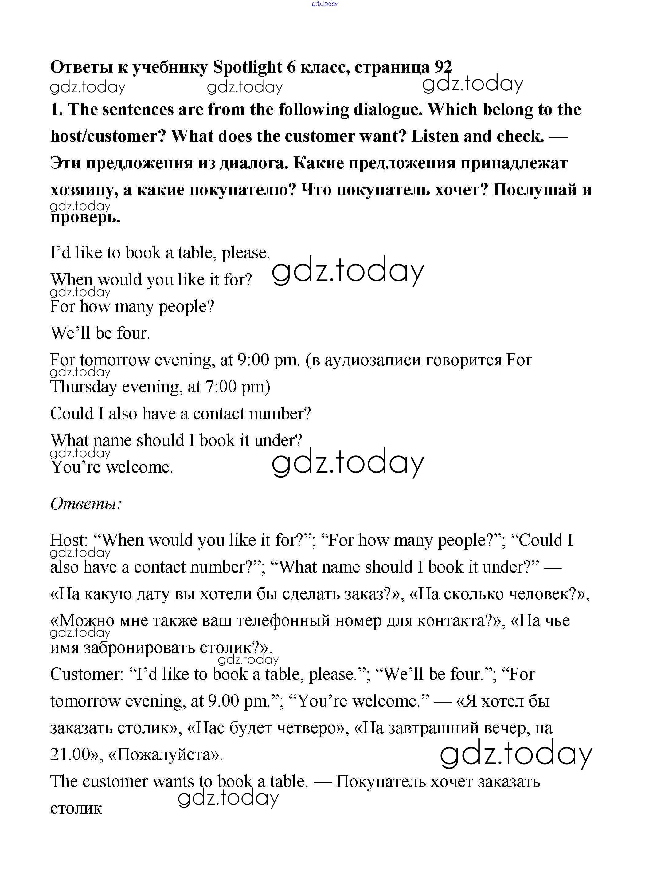 На страницах сайта gdz.today вы найдете учебный и вспомогательный материал, направленный на улучшения знаний школьной программы. ГДЗ - онлайн мир знаний Решение к Module 9. Food & Refreshments. Страницы 92 Учебнику по Английскому языку для 6 класса Ваулина, Дули Просвещение Spotlight 2017