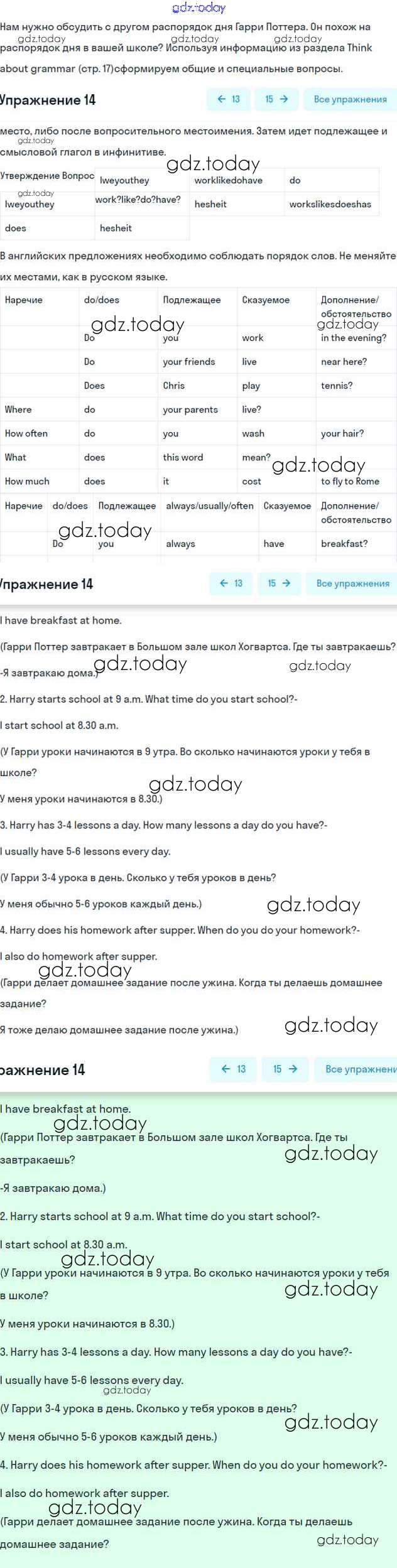 На страницах сайта gdz.today вы найдете учебный и вспомогательный материал, направленный на улучшения знаний школьной программы. ГДЗ - онлайн мир знаний Решение к Unit 2. Daily routines Часть 1 14 Учебнику по Английскому языку для 6 класса Вербицкая, Гаярделли Вентана-граф Forward 2017