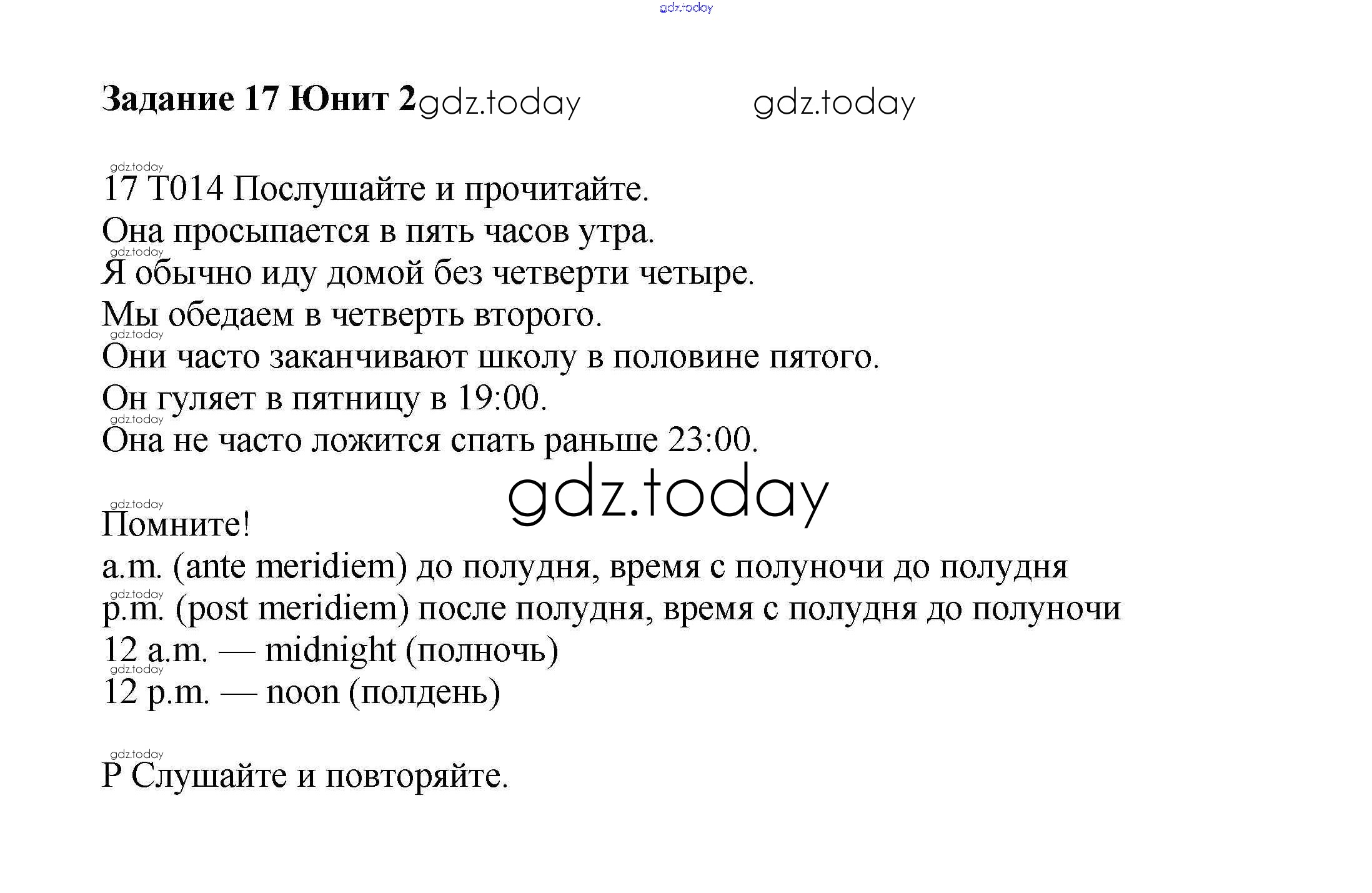 На страницах сайта gdz.today вы найдете учебный и вспомогательный материал, направленный на улучшения знаний школьной программы. ГДЗ - онлайн мир знаний Решение к Unit 2. Daily routines Часть 1 17 Учебнику по Английскому языку для 6 класса Вербицкая, Гаярделли Вентана-граф Forward 2017