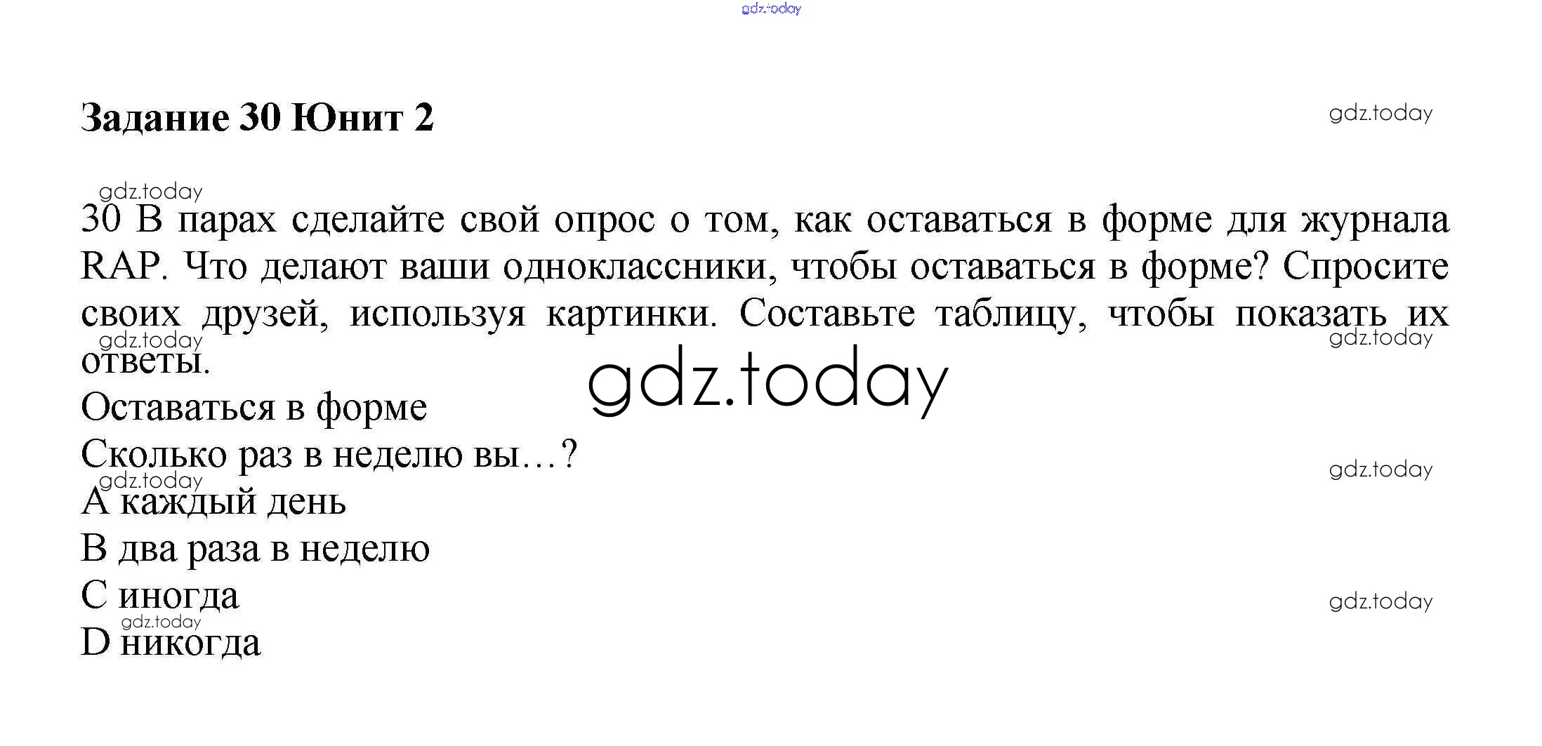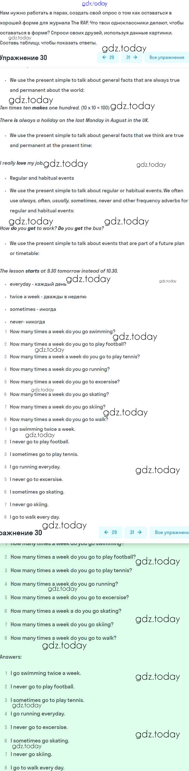 На страницах сайта gdz.today вы найдете учебный и вспомогательный материал, направленный на улучшения знаний школьной программы. ГДЗ - онлайн мир знаний Решение к Unit 2. Daily routines Часть 1 30 Учебнику по Английскому языку для 6 класса Вербицкая, Гаярделли Вентана-граф Forward 2017