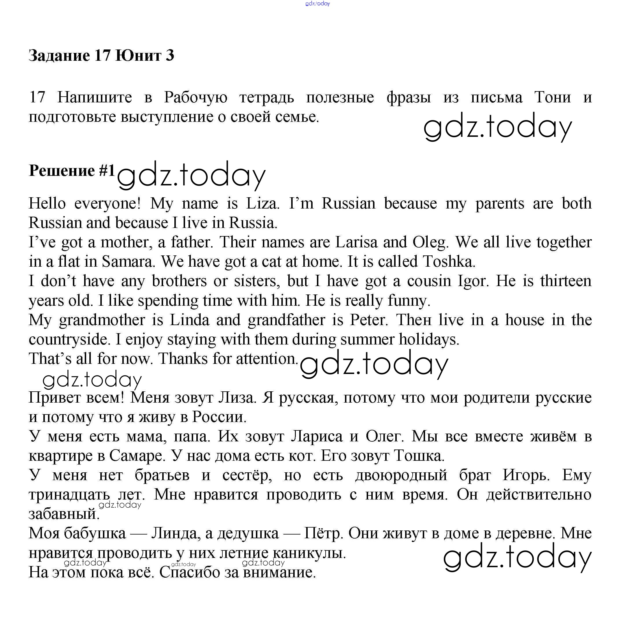 На страницах сайта gdz.today вы найдете учебный и вспомогательный материал, направленный на улучшения знаний школьной программы. ГДЗ - онлайн мир знаний Решение к Unit 3. Family members Часть 1 17 Учебнику по Английскому языку для 6 класса Вербицкая, Гаярделли Вентана-граф Forward 2017