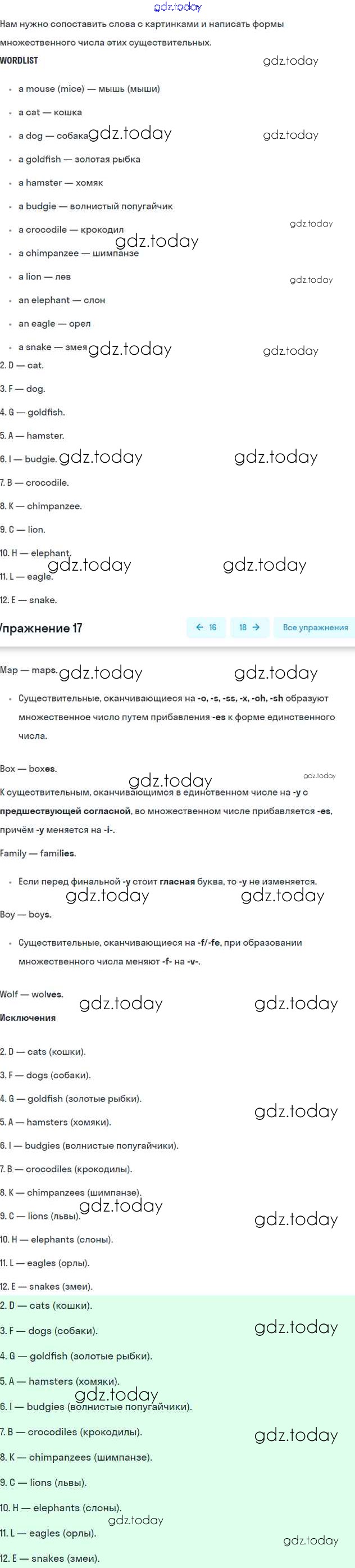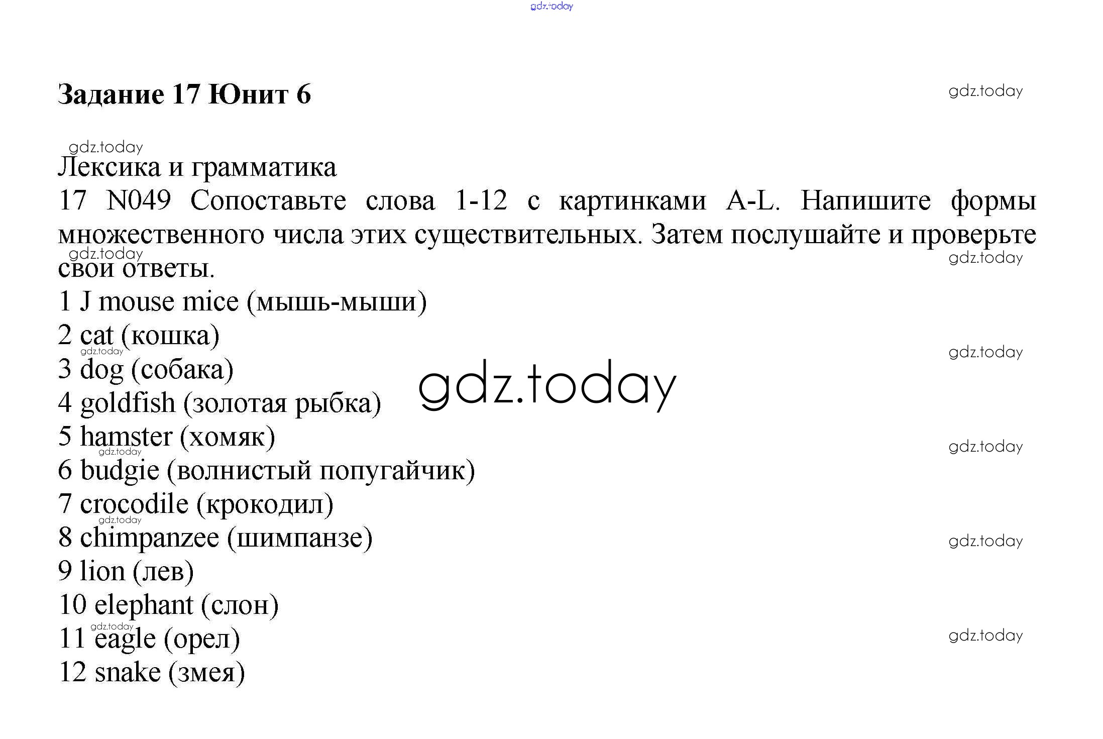 На страницах сайта gdz.today вы найдете учебный и вспомогательный материал, направленный на улучшения знаний школьной программы. ГДЗ - онлайн мир знаний Решение к Unit 6. Animal life Часть 1 17 Учебнику по Английскому языку для 6 класса Вербицкая, Гаярделли Вентана-граф Forward 2017