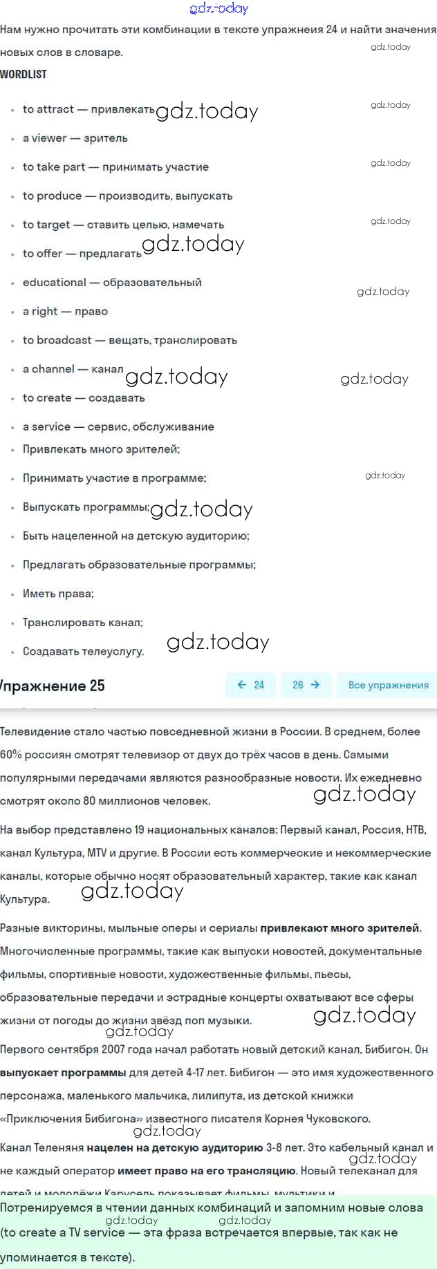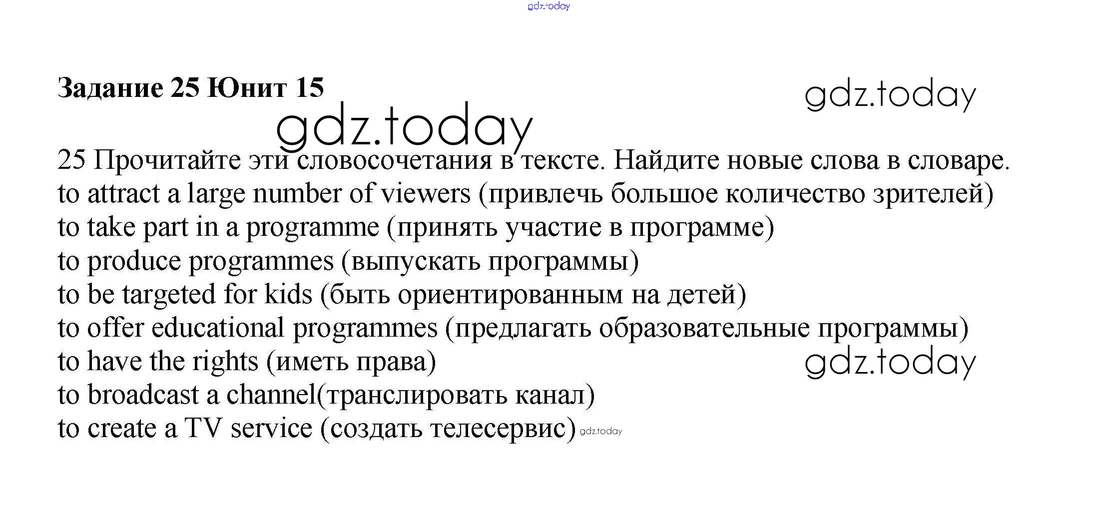 На страницах сайта gdz.today вы найдете учебный и вспомогательный материал, направленный на улучшения знаний школьной программы. ГДЗ - онлайн мир знаний Решение к Unit 15. TV watching Часть 2 25 Учебнику по Английскому языку для 6 класса Вербицкая, Гаярделли Вентана-граф Forward 2017