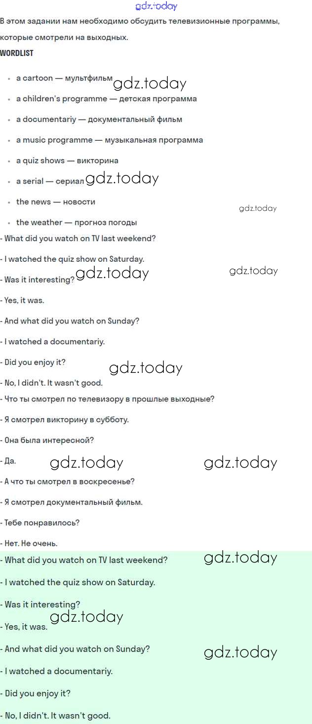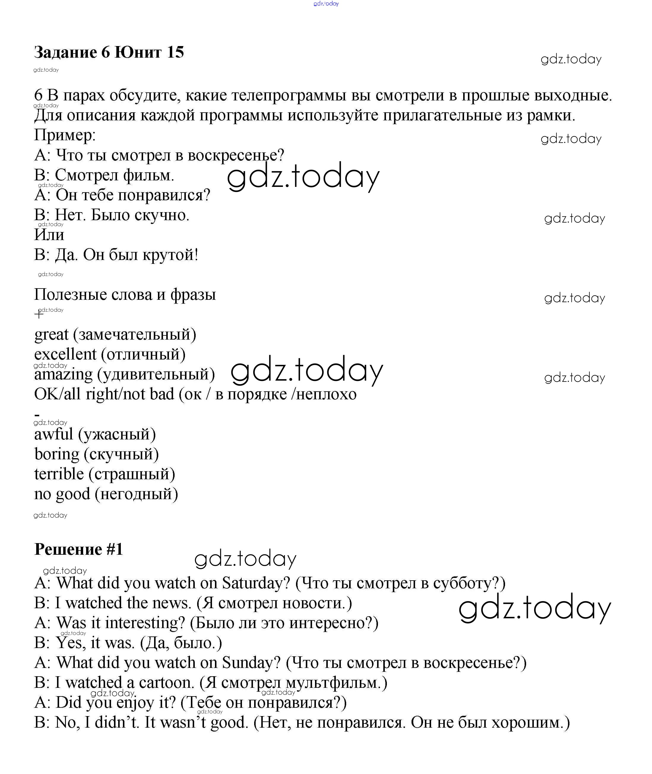 На страницах сайта gdz.today вы найдете учебный и вспомогательный материал, направленный на улучшения знаний школьной программы. ГДЗ - онлайн мир знаний Решение к Unit 15. TV watching Часть 2 6 Учебнику по Английскому языку для 6 класса Вербицкая, Гаярделли Вентана-граф Forward 2017