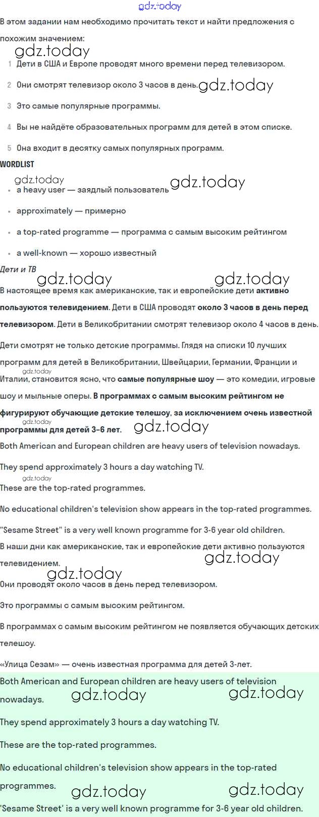 На страницах сайта gdz.today вы найдете учебный и вспомогательный материал, направленный на улучшения знаний школьной программы. ГДЗ - онлайн мир знаний Решение к Unit 15. TV watching Часть 2 8 Учебнику по Английскому языку для 6 класса Вербицкая, Гаярделли Вентана-граф Forward 2017