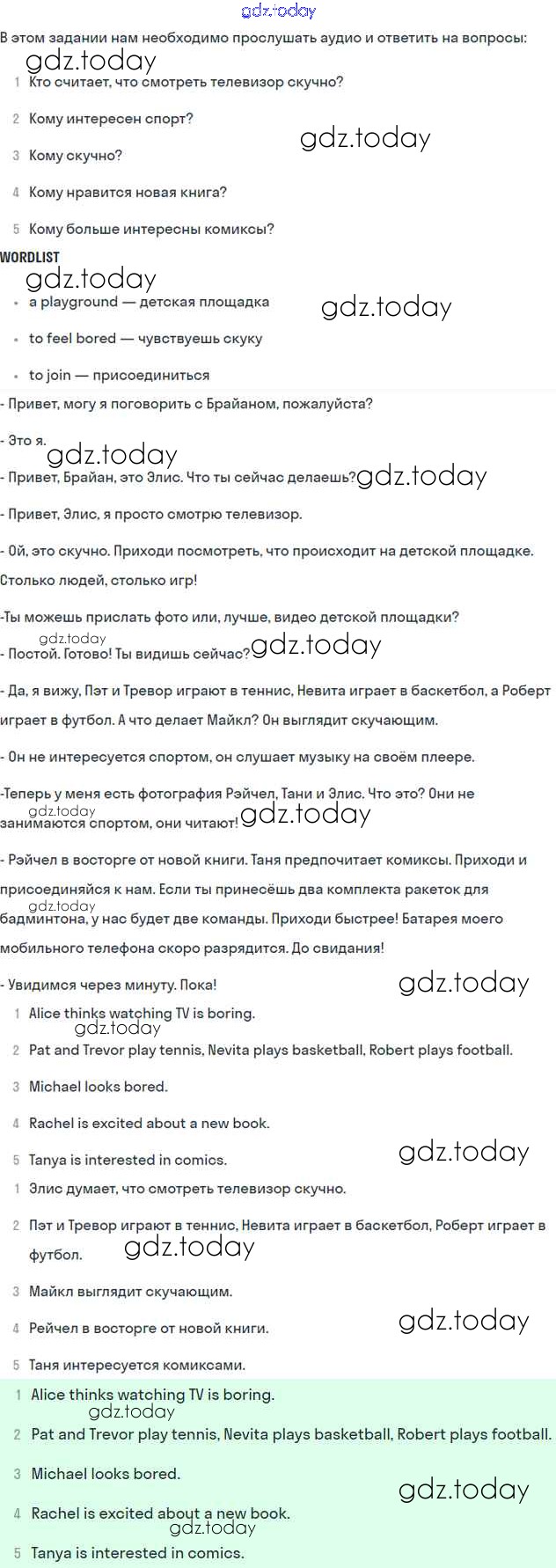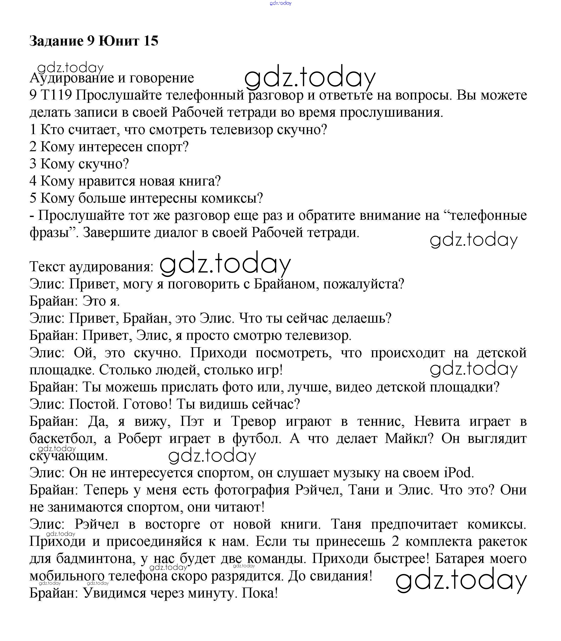 На страницах сайта gdz.today вы найдете учебный и вспомогательный материал, направленный на улучшения знаний школьной программы. ГДЗ - онлайн мир знаний Решение к Unit 15. TV watching Часть 2 9 Учебнику по Английскому языку для 6 класса Вербицкая, Гаярделли Вентана-граф Forward 2017
