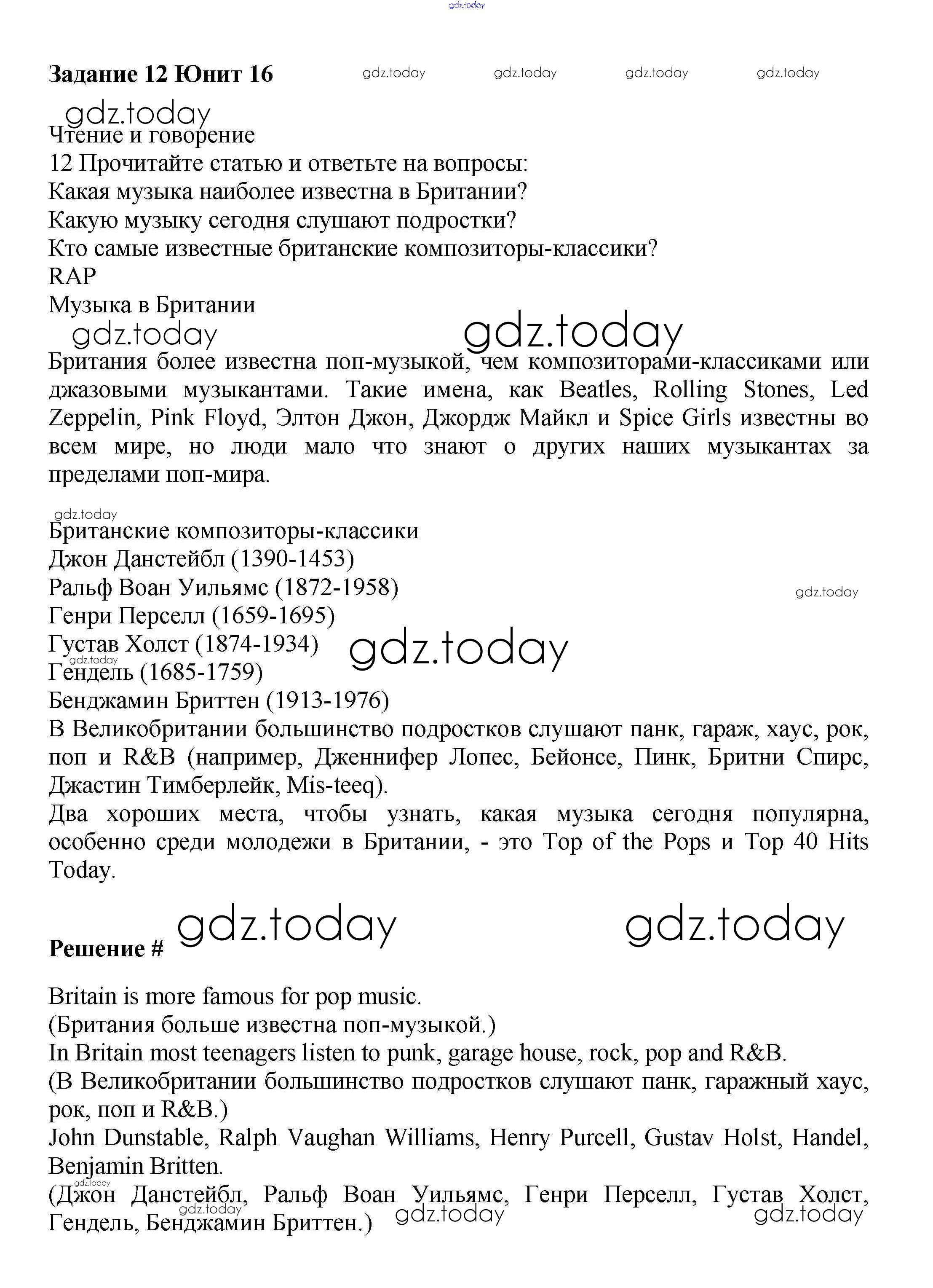 На страницах сайта gdz.today вы найдете учебный и вспомогательный материал, направленный на улучшения знаний школьной программы. ГДЗ - онлайн мир знаний Решение к Unit 16. The world of music Часть 2 12 Учебнику по Английскому языку для 6 класса Вербицкая, Гаярделли Вентана-граф Forward 2017