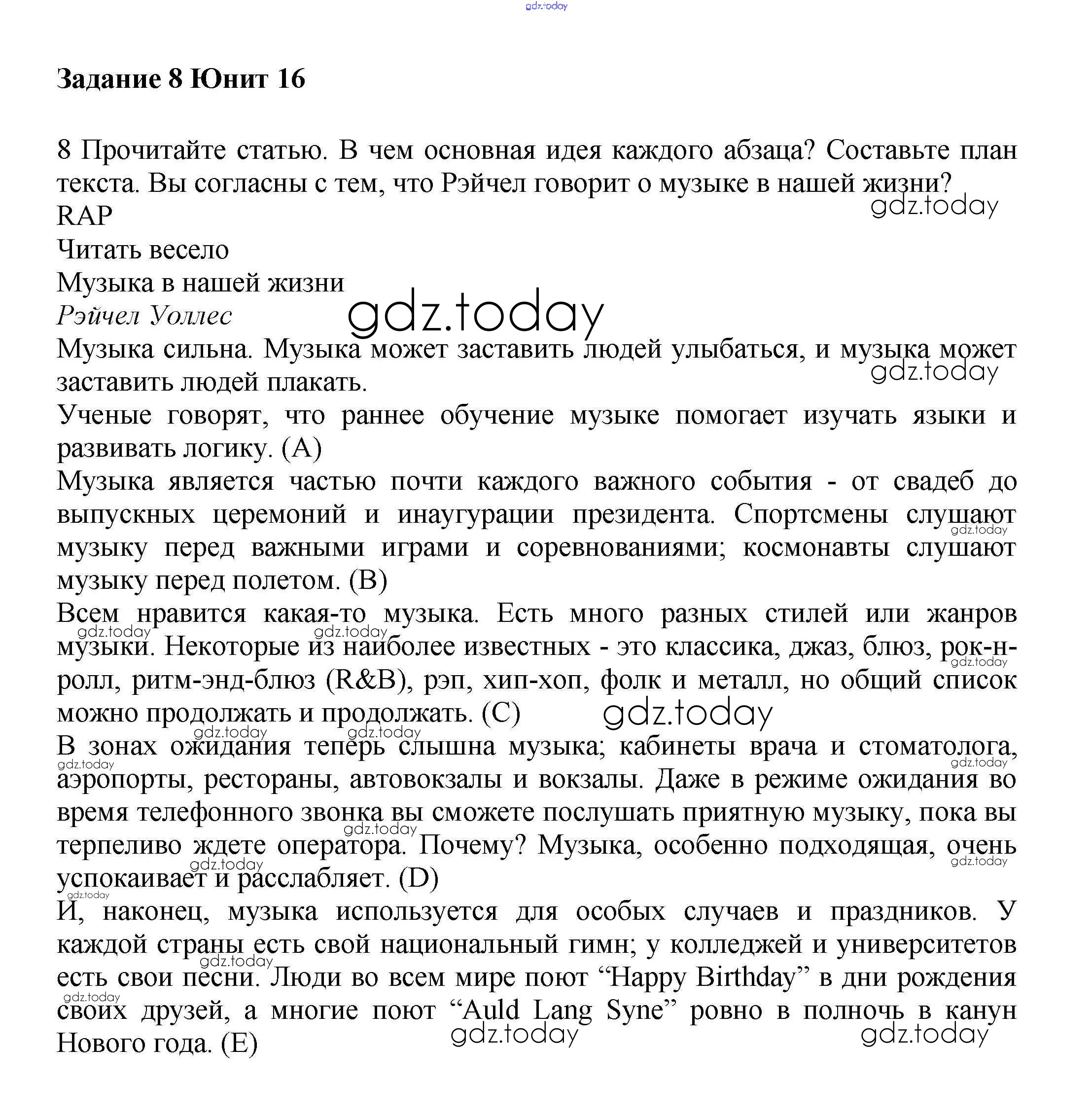 На страницах сайта gdz.today вы найдете учебный и вспомогательный материал, направленный на улучшения знаний школьной программы. ГДЗ - онлайн мир знаний Решение к Unit 16. The world of music Часть 2 8 Учебнику по Английскому языку для 6 класса Вербицкая, Гаярделли Вентана-граф Forward 2017