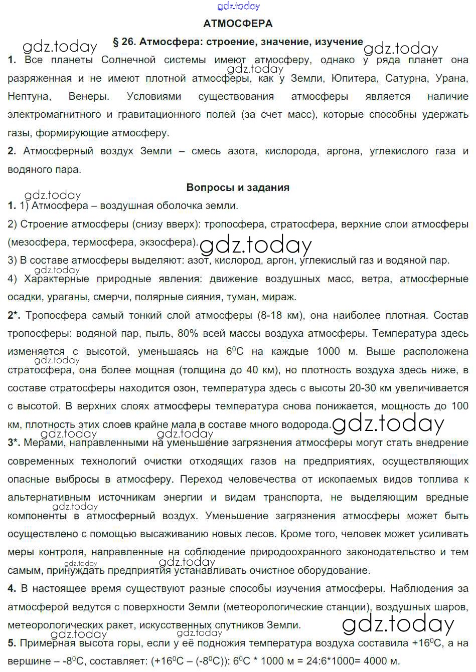 На страницах сайта gdz.today вы найдете учебный и вспомогательный материал, направленный на улучшения знаний школьной программы. ГДЗ - онлайн мир знаний Решение к параграфам §26. Атмосфера - строение, значение, изучение Учебнику по Географии для 6 класса Герасимова, Неклюкова Дрофа Вертикаль 2019