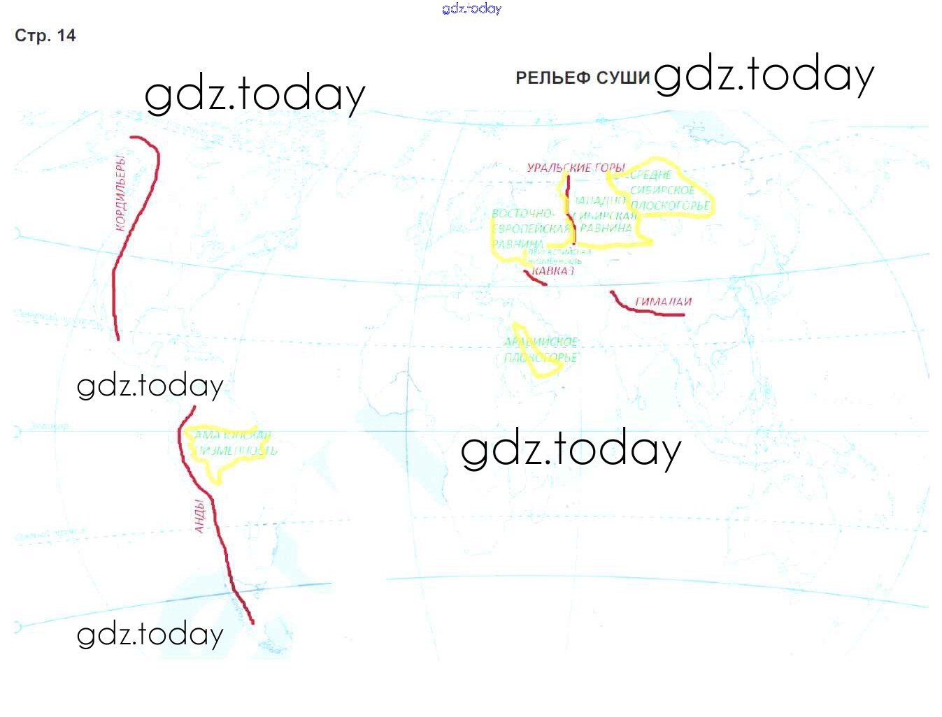 На страницах сайта gdz.today вы найдете учебный и вспомогательный материал, направленный на улучшения знаний школьной программы. ГДЗ - онлайн мир знаний Старое издание (решение) стр.14 Контурным картам по Географии для 6 класса Курчина, Курбский Дрофа 2019
