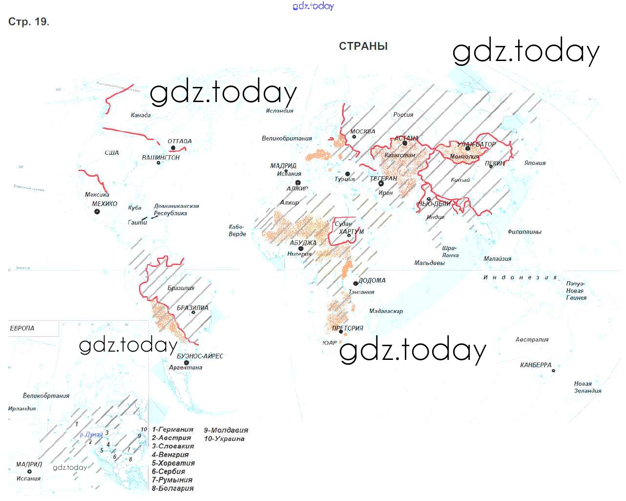 На страницах сайта gdz.today вы найдете учебный и вспомогательный материал, направленный на улучшения знаний школьной программы. ГДЗ - онлайн мир знаний Страницы (решение) 19 Контурным картам по Географии для 6 класса Душина, Летягин Аст/Астрель 2020