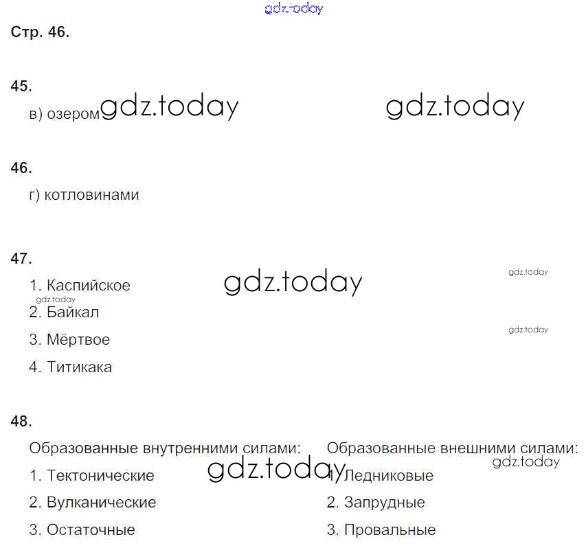 На страницах сайта gdz.today вы найдете учебный и вспомогательный материал, направленный на улучшения знаний школьной программы. ГДЗ - онлайн мир знаний Решение к теме "Гидросфера" (страницы тетради) 46 Рабочей тетради по Географии для 6 класса Дронов, Савельева Дрофа Вертикаль 2016