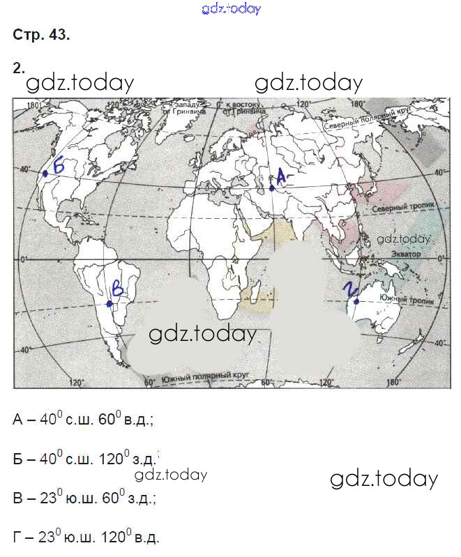 На страницах сайта gdz.today вы найдете учебный и вспомогательный материал, направленный на улучшения знаний школьной программы. ГДЗ - онлайн мир знаний Страницы (решение) 43 Рабочей тетради по Географии для 6 класса Карташева, Курчина Дрофа Вертикаль 2020