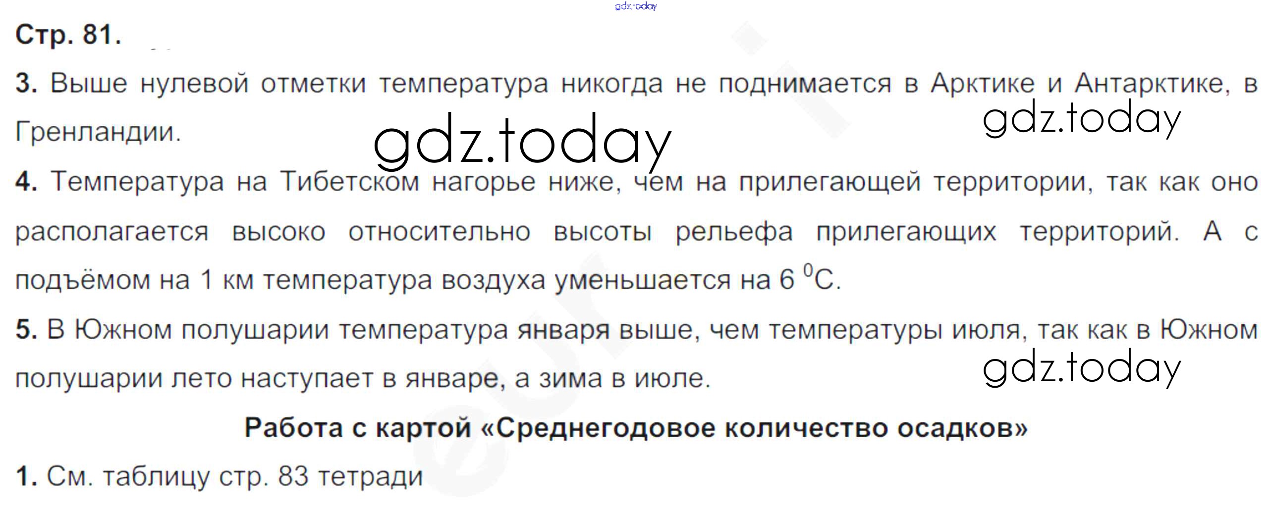 На страницах сайта gdz.today вы найдете учебный и вспомогательный материал, направленный на улучшения знаний школьной программы. ГДЗ - онлайн мир знаний Страницы (решение) 81 Рабочей тетради по Географии для 6 класса Румянцев, Ким Дрофа Вертикаль 2015