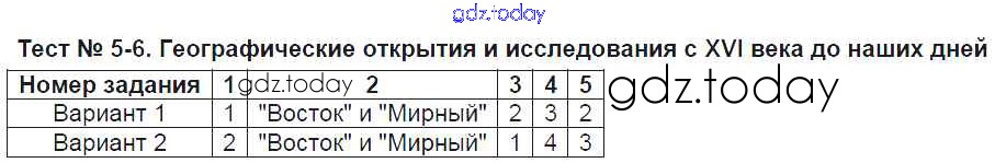 Ответы к Решение к тестам Тест-5-6. Географические открытия и исследования с XVI века до наших дней Тестам по Географии для 6 класса Пятунина, Пятунин Экзамен УМК 2017