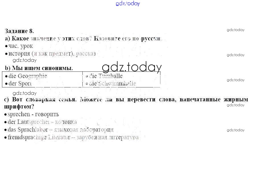 На страницах сайта gdz.today вы найдете учебный и вспомогательный материал, направленный на улучшения знаний школьной программы. ГДЗ - онлайн мир знаний Раздел 6 Решение к главе 4(Разделы) 8 Учебнику по Немецкому языку для 6 класса Бим, Садомова Просвещение 2014