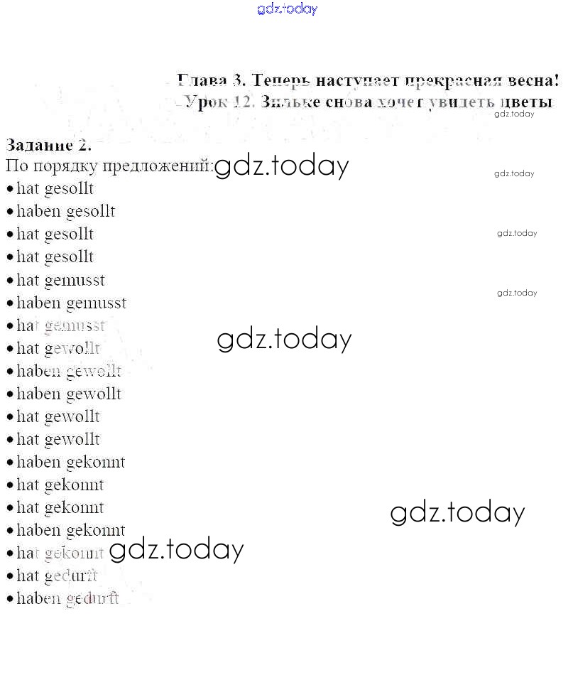 На страницах сайта gdz.today вы найдете учебный и вспомогательный материал, направленный на улучшения знаний школьной программы. ГДЗ - онлайн мир знаний Решение к уроку 12 2 Учебнику по Немецкому языку для 6 класса Радченко, Хебелер Дрофа Alles Klar! 2014