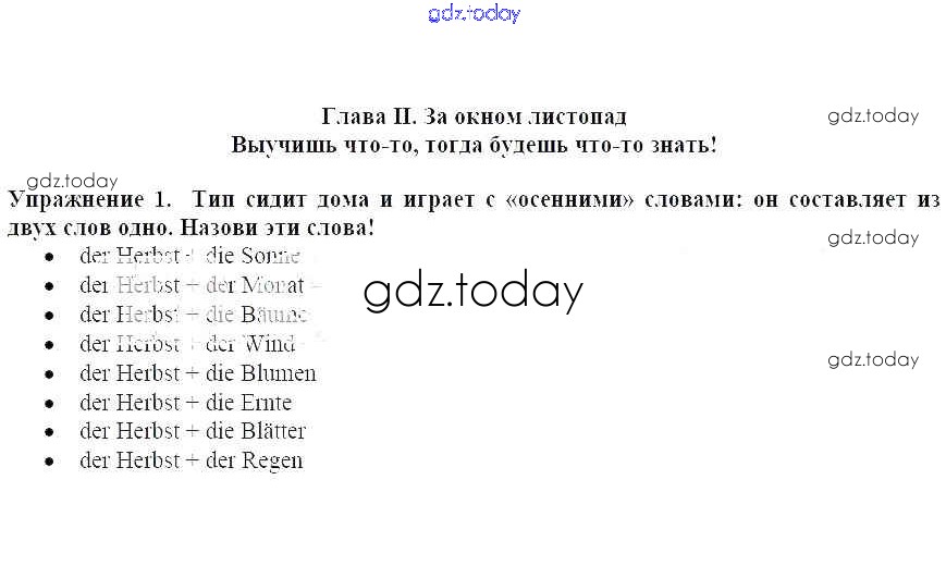 На страницах сайта gdz.today вы найдете учебный и вспомогательный материал, направленный на улучшения знаний школьной программы. ГДЗ - онлайн мир знаний Выучишь что-то, тогда будешь что-то знать Решение к главе 2. За окном листопад 1 Рабочей тетради по Немецкому языку для 6 класса Бим, Фомичева Просвещение 2008