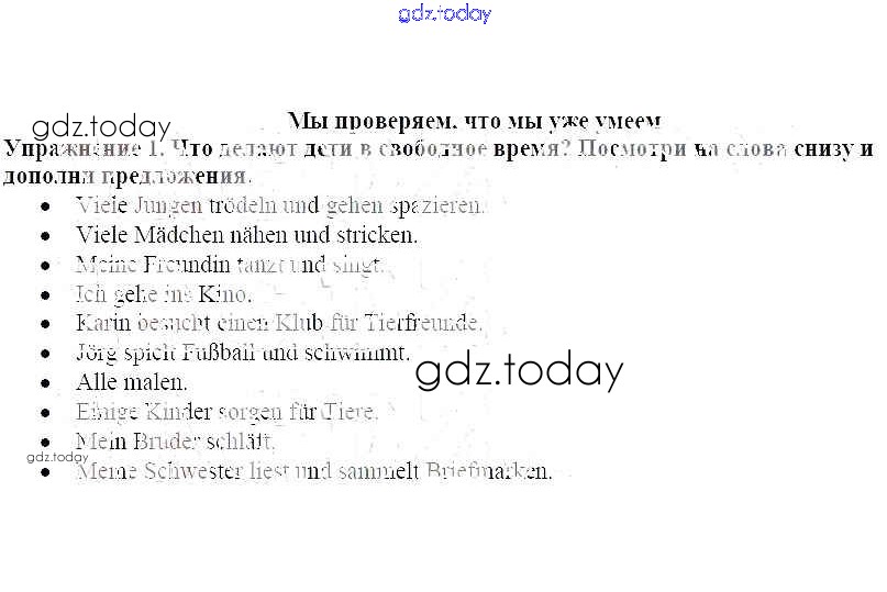 На страницах сайта gdz.today вы найдете учебный и вспомогательный материал, направленный на улучшения знаний школьной программы. ГДЗ - онлайн мир знаний Мы проверяем, что мы уже умеем Решение к главе 5. Один день нашей жизни 1 Рабочей тетради по Немецкому языку для 6 класса Бим, Фомичева Просвещение 2008