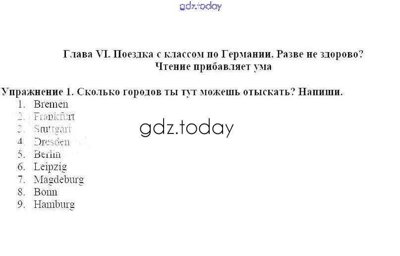На страницах сайта gdz.today вы найдете учебный и вспомогательный материал, направленный на улучшения знаний школьной программы. ГДЗ - онлайн мир знаний Чтение прибавляет ума Решение к главе 6. Поездка с классом по Германии 1 Рабочей тетради по Немецкому языку для 6 класса Бим, Фомичева Просвещение 2008