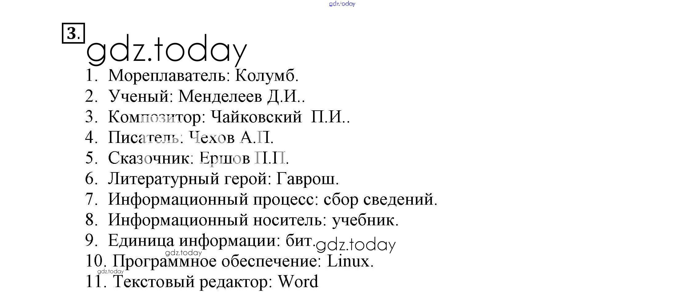 На страницах сайта gdz.today вы найдете учебный и вспомогательный материал, направленный на улучшения знаний школьной программы. ГДЗ - онлайн мир знаний Решение к заданиям 3 Рабочей тетради по Информатике для 6 класса Босова Бином 2017