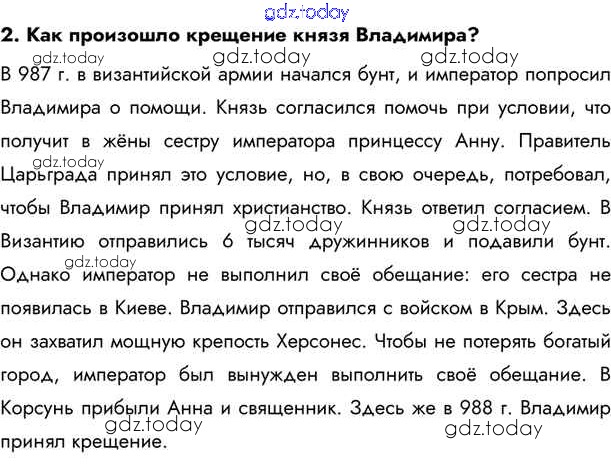 На страницах сайта gdz.today вы найдете учебный и вспомогательный материал, направленный на улучшения знаний школьной программы. ГДЗ - онлайн мир знаний §7. Князь Владимир и Крещение Руси Учебник 2020 (решение) стр.61 Учебнику по Истории России для 6 класса Андреев, Федоров Дрофа, Дрофа Вертикаль 2016, 2020