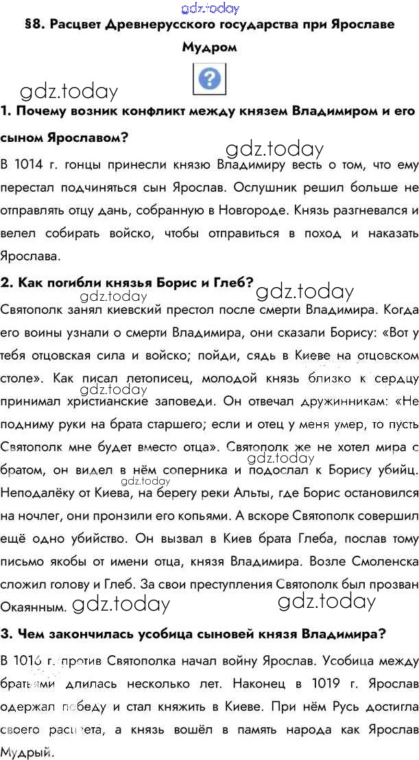 На страницах сайта gdz.today вы найдете учебный и вспомогательный материал, направленный на улучшения знаний школьной программы. ГДЗ - онлайн мир знаний §8. Расцвет Древнерусского государства при Ярославе Мудром Учебник 2020 (решение) стр.69 Учебнику по Истории России для 6 класса Андреев, Федоров Дрофа, Дрофа Вертикаль 2016, 2020