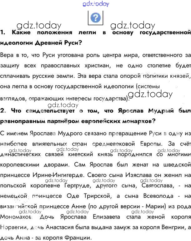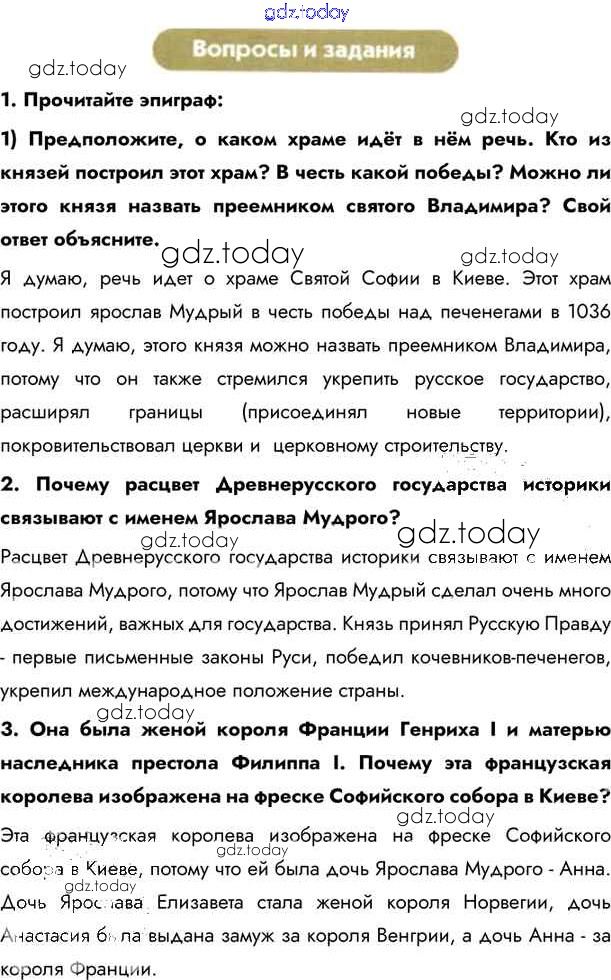 На страницах сайта gdz.today вы найдете учебный и вспомогательный материал, направленный на улучшения знаний школьной программы. ГДЗ - онлайн мир знаний §8. Расцвет Древнерусского государства при Ярославе Мудром Учебник 2020 (решение) стр.73 Учебнику по Истории России для 6 класса Андреев, Федоров Дрофа, Дрофа Вертикаль 2016, 2020