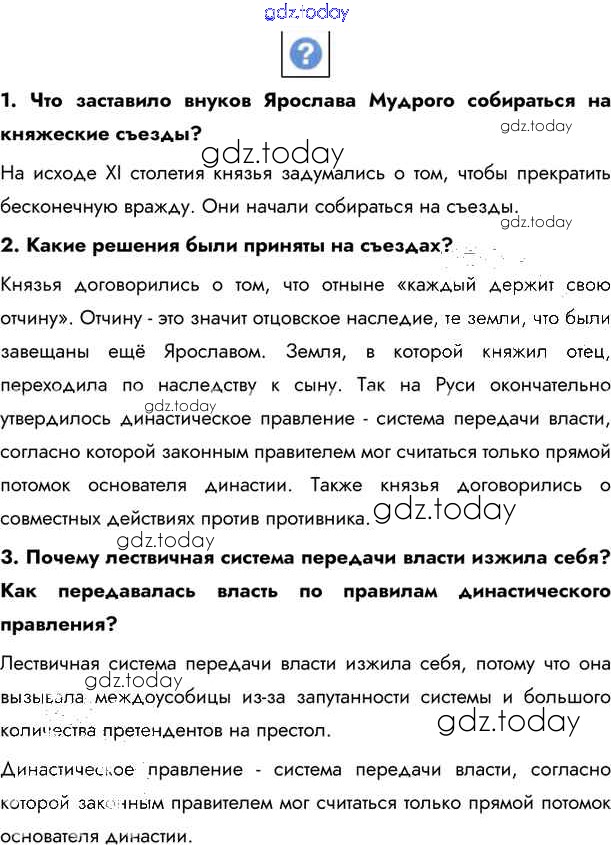 На страницах сайта gdz.today вы найдете учебный и вспомогательный материал, направленный на улучшения знаний школьной программы. ГДЗ - онлайн мир знаний §9. Дети и внуки Ярослава Мудрого Учебник 2020 (решение) стр.80 Учебнику по Истории России для 6 класса Андреев, Федоров Дрофа, Дрофа Вертикаль 2016, 2020