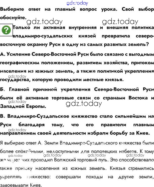 На страницах сайта gdz.today вы найдете учебный и вспомогательный материал, направленный на улучшения знаний школьной программы. ГДЗ - онлайн мир знаний §14. Владимиро-Суздальское княжество Учебник 2020 (решение) стр.127 Учебнику по Истории России для 6 класса Андреев, Федоров Дрофа, Дрофа Вертикаль 2016, 2020