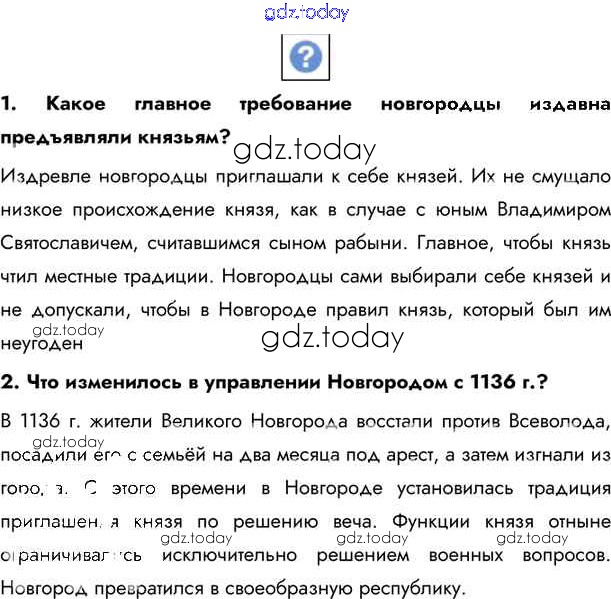 На страницах сайта gdz.today вы найдете учебный и вспомогательный материал, направленный на улучшения знаний школьной программы. ГДЗ - онлайн мир знаний §15. Новгородская боярская республика Учебник 2020 (решение) стр.132 Учебнику по Истории России для 6 класса Андреев, Федоров Дрофа, Дрофа Вертикаль 2016, 2020