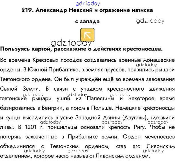 На страницах сайта gdz.today вы найдете учебный и вспомогательный материал, направленный на улучшения знаний школьной программы. ГДЗ - онлайн мир знаний §19. Александр Невский и отражение натиска с запада Учебник 2020 (решение) стр.164 Учебнику по Истории России для 6 класса Андреев, Федоров Дрофа, Дрофа Вертикаль 2016, 2020