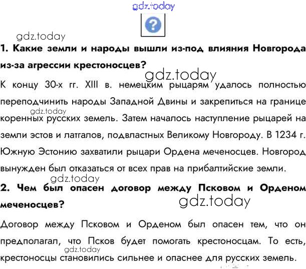 На страницах сайта gdz.today вы найдете учебный и вспомогательный материал, направленный на улучшения знаний школьной программы. ГДЗ - онлайн мир знаний §19. Александр Невский и отражение натиска с запада Учебник 2020 (решение) стр.166 Учебнику по Истории России для 6 класса Андреев, Федоров Дрофа, Дрофа Вертикаль 2016, 2020