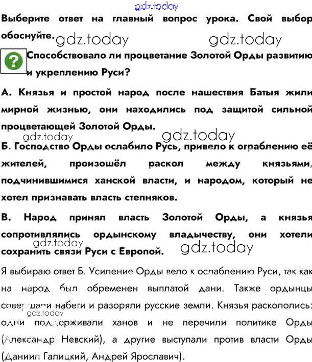На страницах сайта gdz.today вы найдете учебный и вспомогательный материал, направленный на улучшения знаний школьной программы. ГДЗ - онлайн мир знаний §20. Золотая Орда и русские земли Учебник 2020 (решение) стр.179 Учебнику по Истории России для 6 класса Андреев, Федоров Дрофа, Дрофа Вертикаль 2016, 2020
