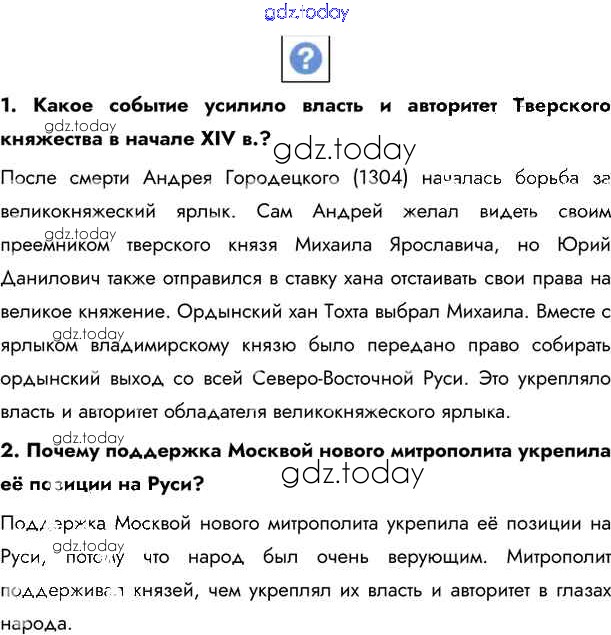 На страницах сайта gdz.today вы найдете учебный и вспомогательный материал, направленный на улучшения знаний школьной программы. ГДЗ - онлайн мир знаний §21. Борьба Москвы и Твери Учебник 2020 (решение) стр.184 Учебнику по Истории России для 6 класса Андреев, Федоров Дрофа, Дрофа Вертикаль 2016, 2020