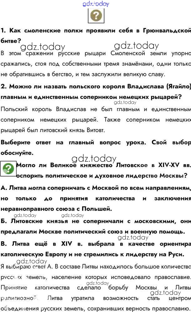 На страницах сайта gdz.today вы найдете учебный и вспомогательный материал, направленный на улучшения знаний школьной программы. ГДЗ - онлайн мир знаний §22. Великое княжество Литовское и Русское Учебник 2020 (решение) стр.197 Учебнику по Истории России для 6 класса Андреев, Федоров Дрофа, Дрофа Вертикаль 2016, 2020