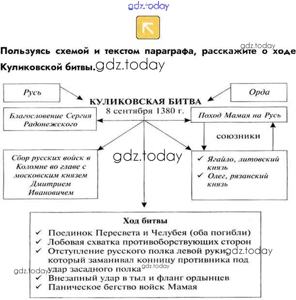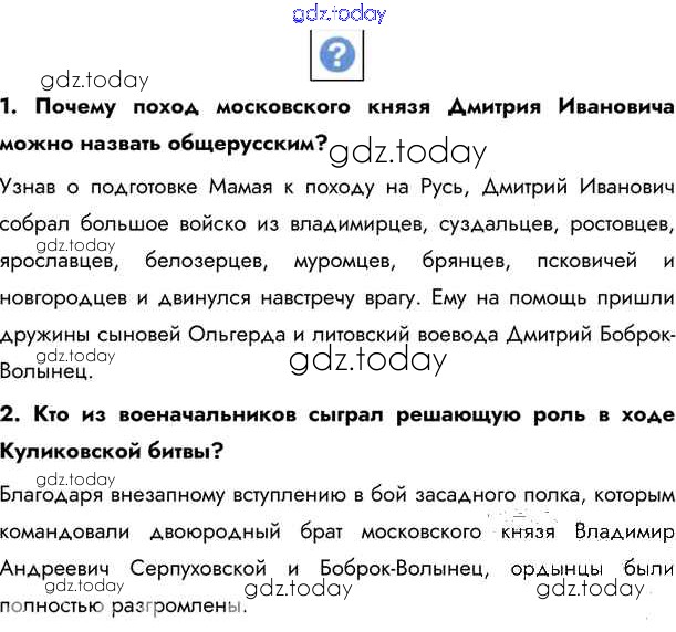 На страницах сайта gdz.today вы найдете учебный и вспомогательный материал, направленный на улучшения знаний школьной программы. ГДЗ - онлайн мир знаний §23. Дмитрий Донской и победа на Куликовом поле Учебник 2020 (решение) стр.202 Учебнику по Истории России для 6 класса Андреев, Федоров Дрофа, Дрофа Вертикаль 2016, 2020