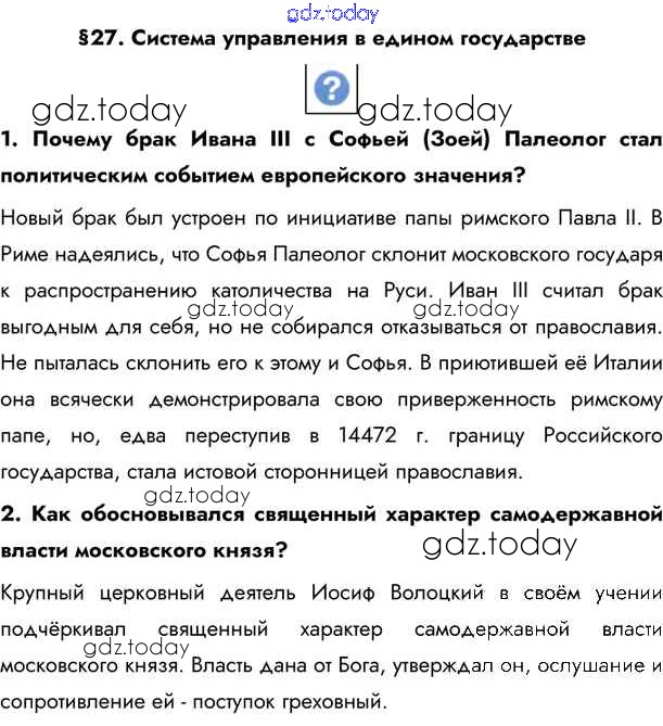 На страницах сайта gdz.today вы найдете учебный и вспомогательный материал, направленный на улучшения знаний школьной программы. ГДЗ - онлайн мир знаний §27. Система управления в едином государстве Учебник 2020 (решение) стр.237 Учебнику по Истории России для 6 класса Андреев, Федоров Дрофа, Дрофа Вертикаль 2016, 2020
